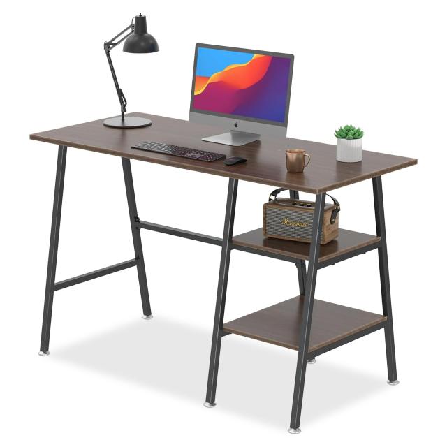 ?【安定性と耐久性抜群】 左右入れ替え可能な2つの収納棚があり、文房具などを手に届くところに保管するのに十分なスペースを提供することができます。2つのオープンシェルフを備えたデスクは、パソコンデスク、学習テーブル、本棚などとして書斎、寝室、リビングルーム、オフィスなどの場合に最適です。なお、4つ脚先には調節可能なアジャスターも装備しており、ガタガタ音が防止できるのみならずフローリングの傷を防止することもできます。