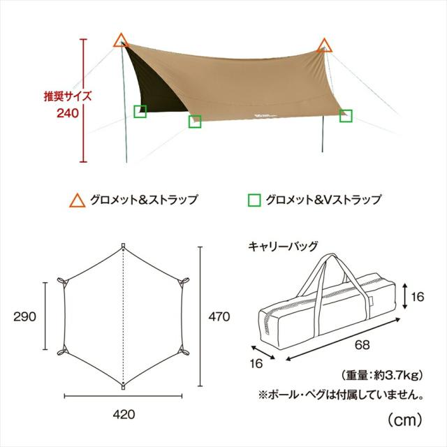 Hi-TC ヘキサタープ470 大型 470×420cm 六角形 タープテント ポール 別売 軽量 厚手 耐久性 遮光性 断熱性 耐水性 保温 防水 ポリコットン 収納バッグ付 ソロキャンプ デイキャンプ アウトドア BBQ 防水 父の日 テントファクトリー TF-TCHT470