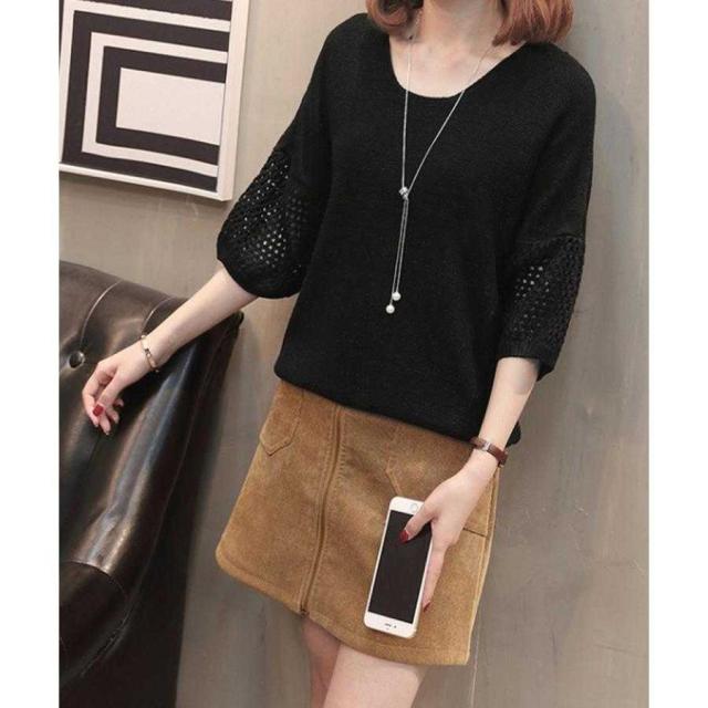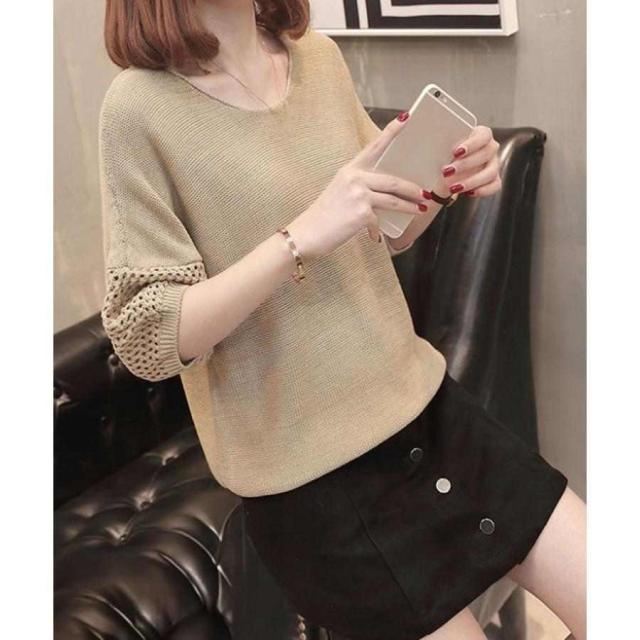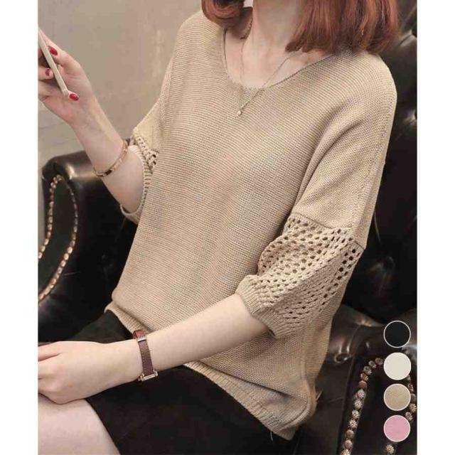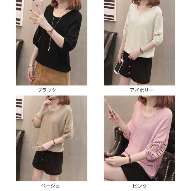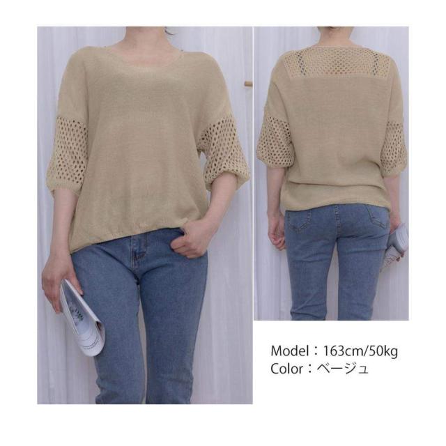 透かし編みスリーブがポイントの、涼しげな半袖ニットトップス