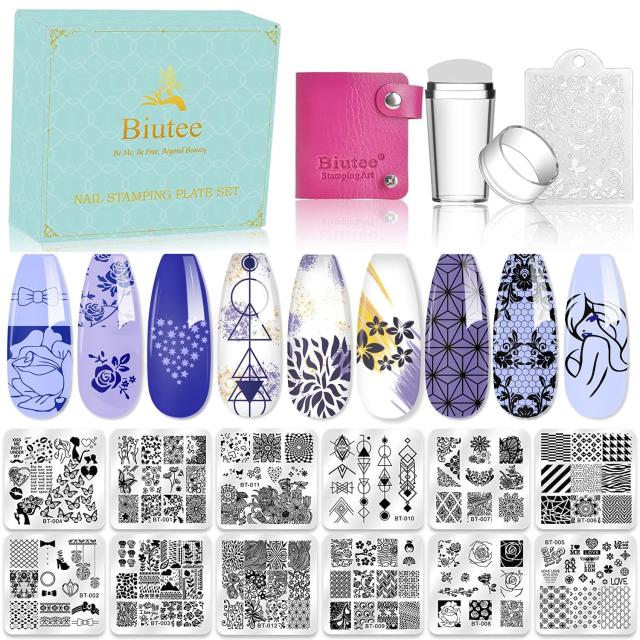 Biutee ネイルイメージプレートセット 12枚ネイルプレート 1スタンプ 1スクレーパー 1カードバッグ ネイルステンシル ネイルプレート ネ