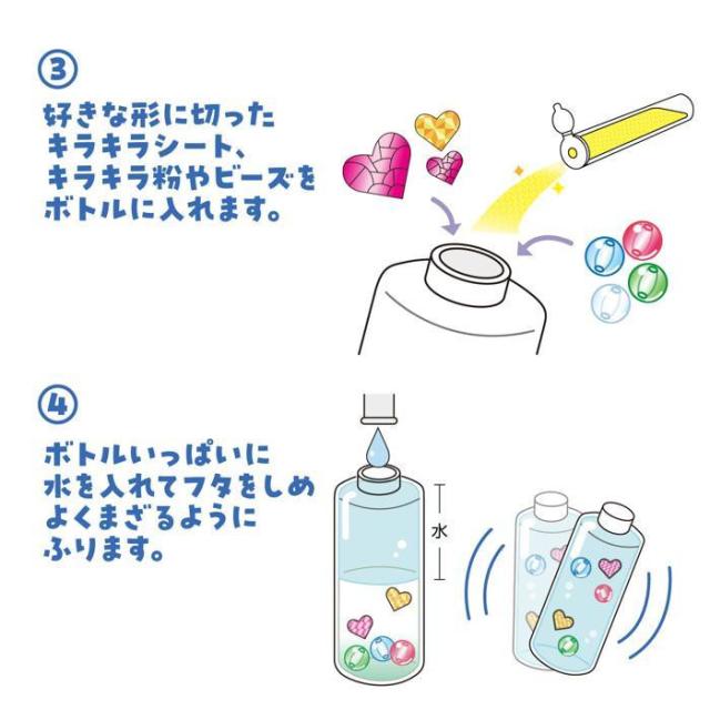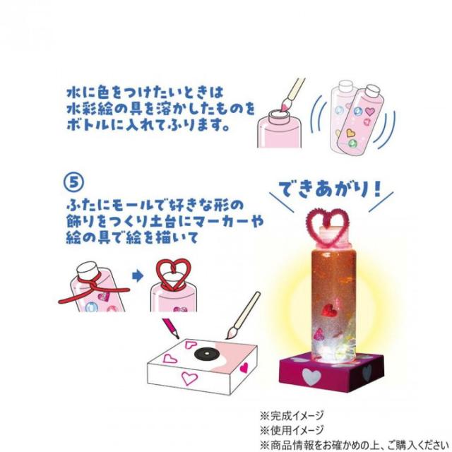 商品詳細:ライトに照らされてビーズやラメがキラキラ舞うスノードームが作れます。キラキラ粉付です。台に絵が描けます。コインライト付。 生産国:中国 素材・材質:PET、砂、PVAのり 商品サイズ:完成サイズ:約70×150×70mm 重量:130g セット内容:キラキラ粉(2g)×1、透明プラスチックボトル×1、キラキラシートセット×1、水のり×1、クリアビーズセット(20個入)×1、LEDコインライト×1、カラーモール(色取り混ぜ)×1、土台台紙×1