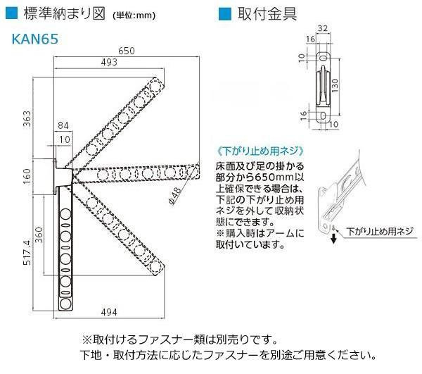| 仕様 | 用途:窓壁取り付け用の物干し掛け 壁面からの出幅:使用時最大650mm/収納時84mm 耐荷重:30kg(1セットあたり) 取り付けに必要な道具:電動ドリル、プラスドライバー |
