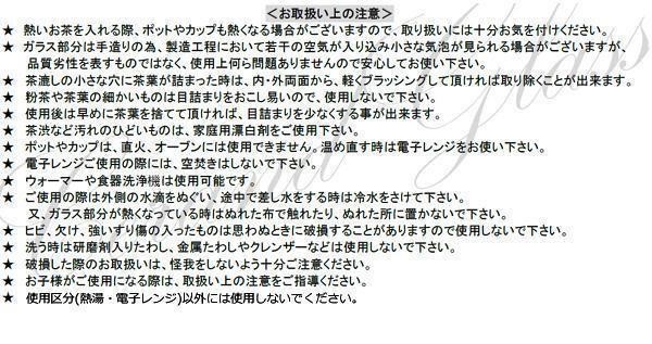 商品詳細:ガラスのティーポットに有田焼の茶こしがおしゃれ☆日本茶・紅茶・中国茶・ハーブティーなどいろんなお茶にご使用下さい♪ 生産国:ポット・蓋:中国、茶こし:日本 素材・材質:ポット・蓋:耐熱ガラス茶こし:磁器(有田焼) 商品サイズ:約11×14.5×H13cm 仕様:容量:約500cc耐熱温度差:120度電子レンジ使用可食洗機使用可 セット内容:蓋付ポット×1、茶こし×1