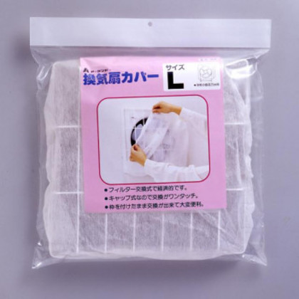 | 換気扇の羽根の直径25cmに取り付け出来ます。フィルターはキャップ式(ゴム付)なので、本体を外さなくても、かぶせるだけで交換が簡単です。難燃特殊フィルターなので、熱に強く安心です。交換時期は、約1カ月が目安です。交換用キャップフィルターはA-63「交換用キャップフィルターLサイズ(3枚入)」をご使用下さい。 |
