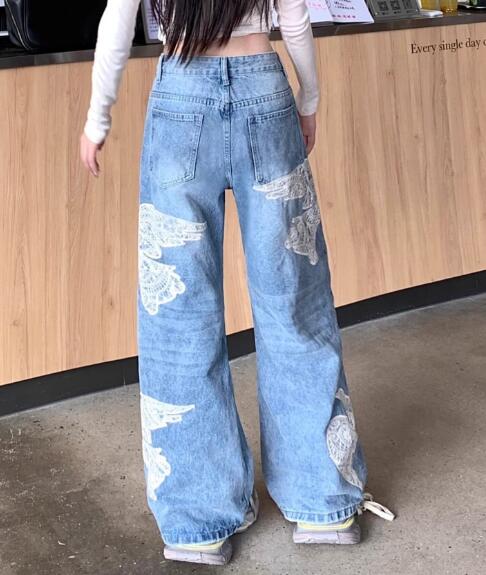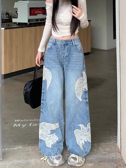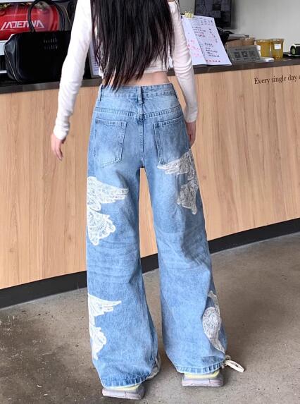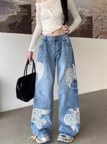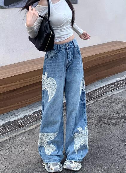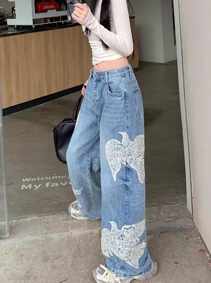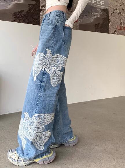レース刺繍デニムズボンボトムスパンツジーンズジーパンストレートロングシンプルダンス衣装ヒップホップHIPHOPレディースガールズストリート奇抜派手韓国ビッグ大きいサイズかわいい