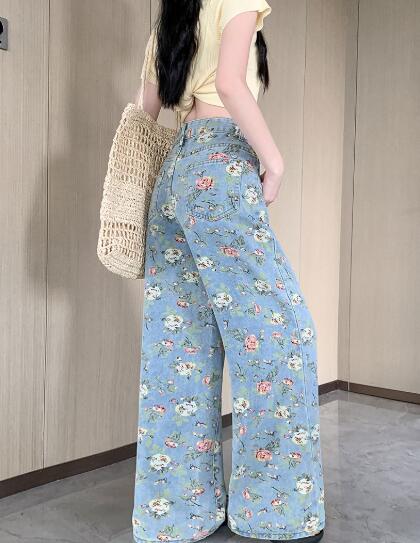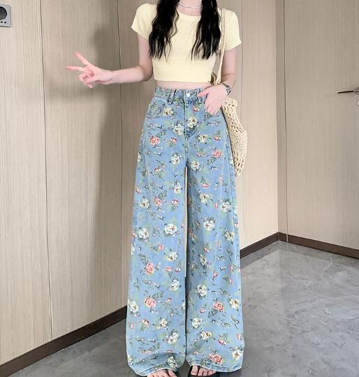フラワー花柄総柄 ジーンズジーパン パンツズボンボトムスポケットデニム太い太めダンス衣装ヒップホップHIPHOPレディースガールズストリート大きいサイズかっこいい個性的韓国ファッション
