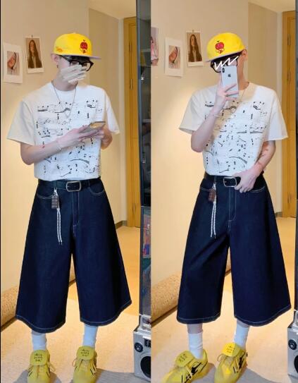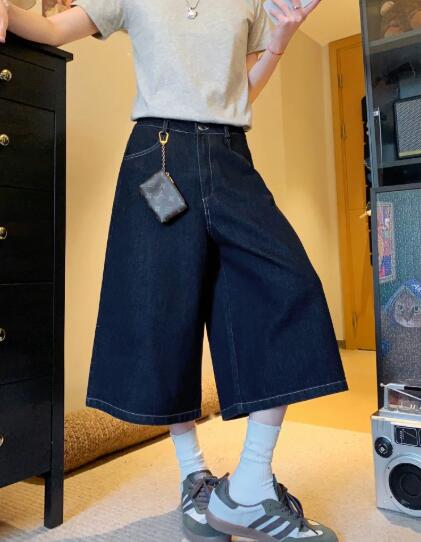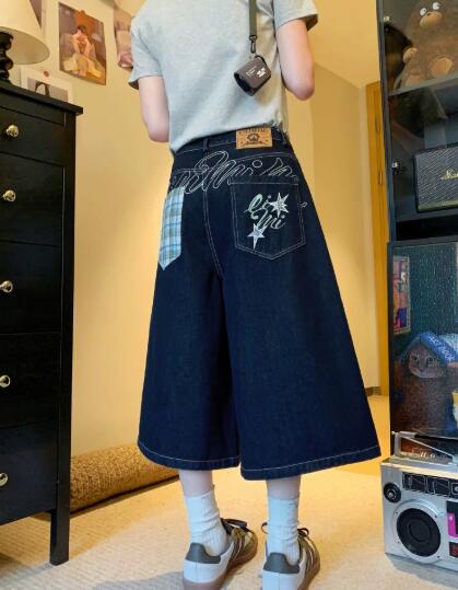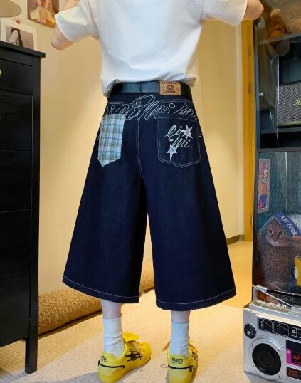 刺繍デニムズボンボトムスパンツジーンズジーパン半ズボン膝上ワイド太いシンプルダンス衣装ヒップホップHIPHOPレディースメンズガールズストリート 奇抜派手韓国ビッグ大きいサイズ
