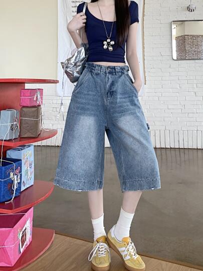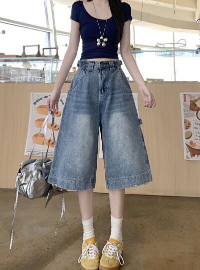 デニムズボンボトムスパンツジーンズジーパン半ズボン膝上ワイド太いシンプルダンス衣装ヒップホップHIPHOPレディースガールズストリート 奇抜派手韓国ビッグ大きいサイズ
