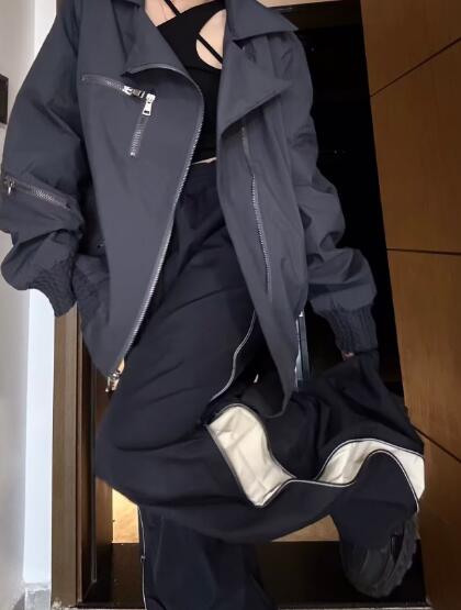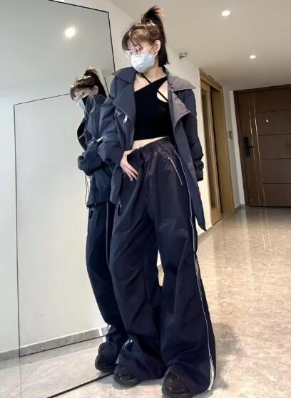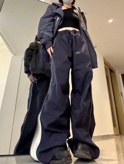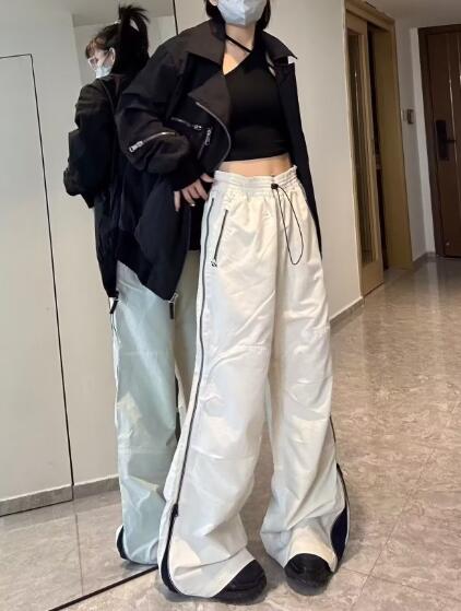 バイカラーズボンボトムスパンツブラック黒ベージュサイドジッパーゴムシンプル太めダンス衣装ヒップホップHIPHOPレディースメンズガールズストリート大人