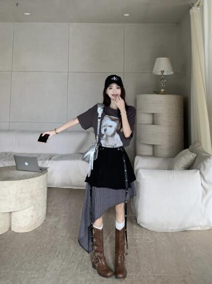 アシンメトリーベルトチェック柄スカートロングレディースガールズおしゃれ可愛いかっこいい韓国ファッションボトムス膝下ストリート個性的