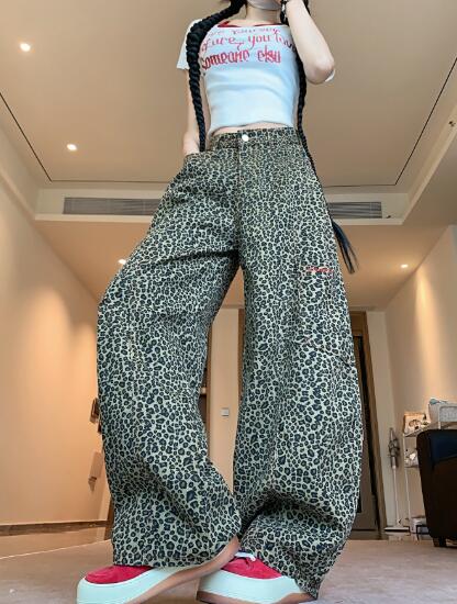 ヒョウ柄レオパード ジーンズジーパン パンツズボンボトムスポケットデニム太い太めダンス衣装ヒップホップHIPHOPレディースガールズストリート大きいサイズかっこいい個性的韓国ファッション