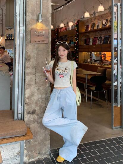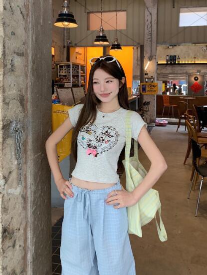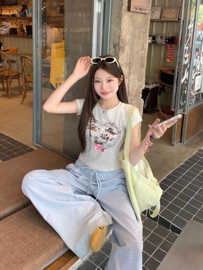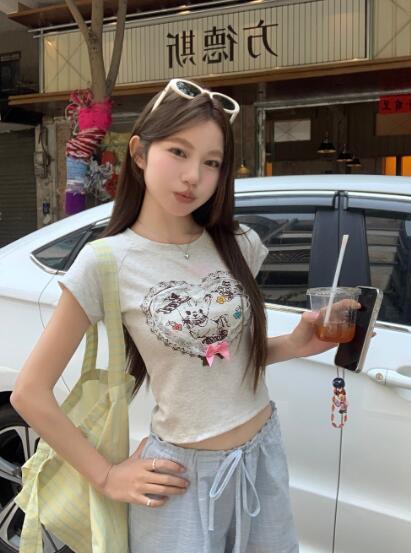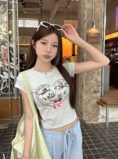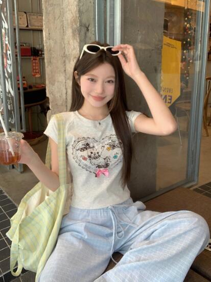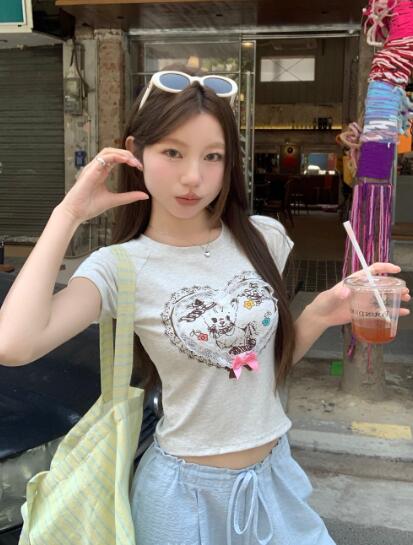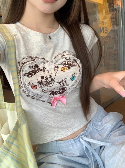 リボンレース切替猫ネコ半袖トップスカットソーTシャツ短い短めシンプルレディースガールズストリート個性的奇抜韓国おしゃれ可愛い