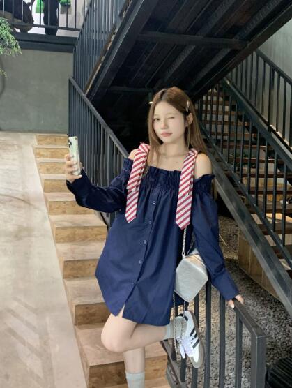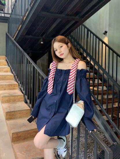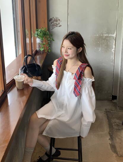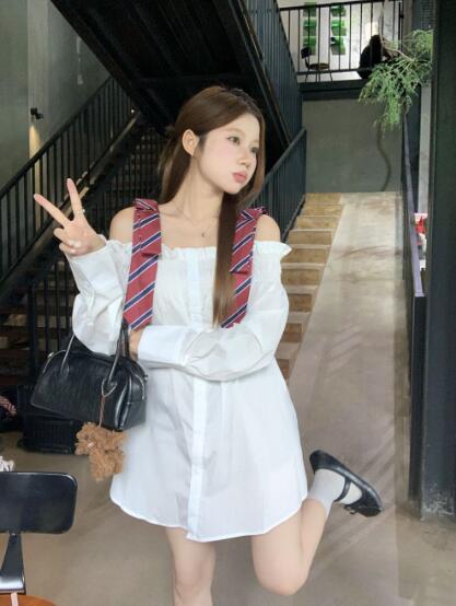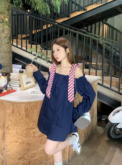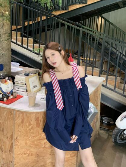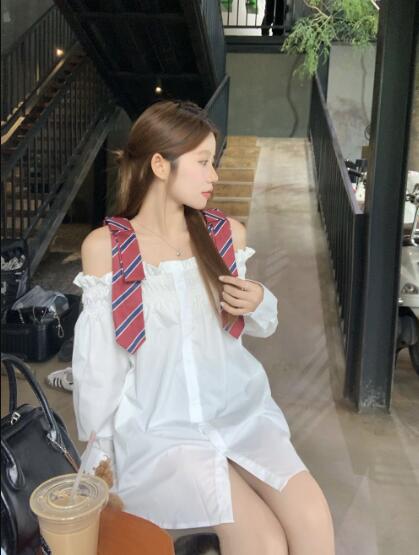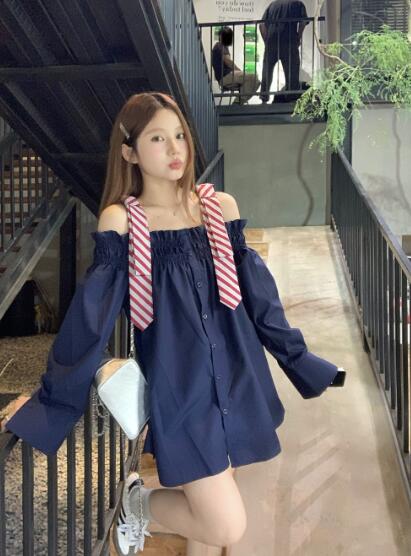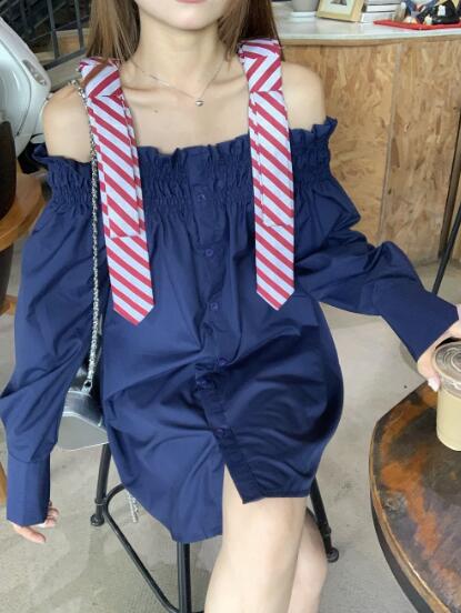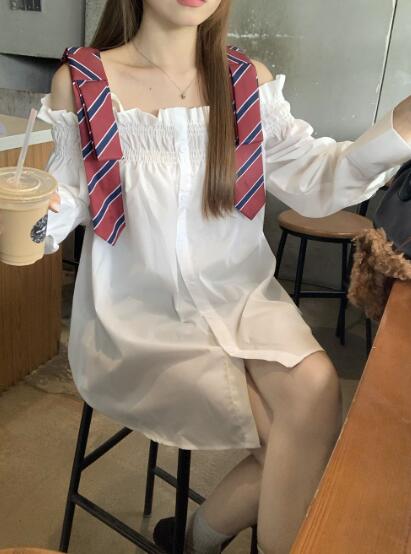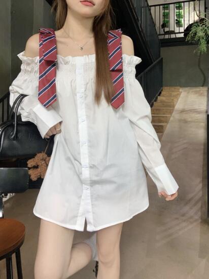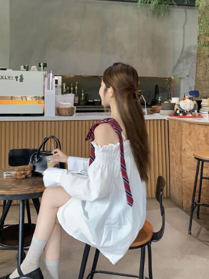 オフショルダーリボントップスカットソーシャツブラウス長めデザインレディースガールズストリート個性的奇抜韓国おしゃれ可愛い