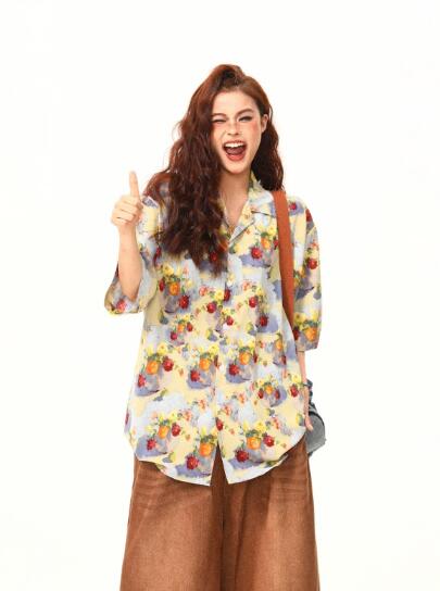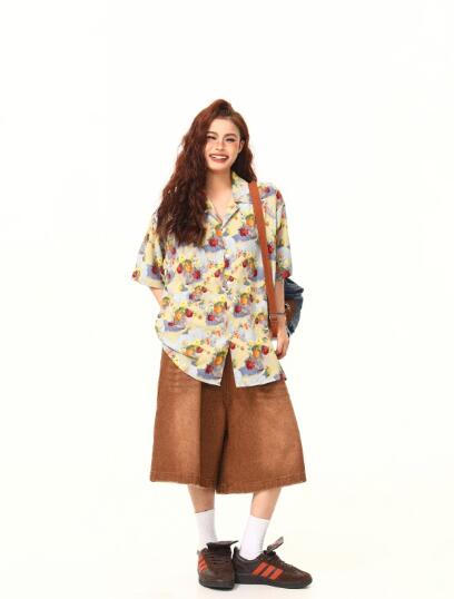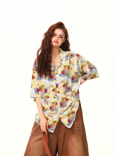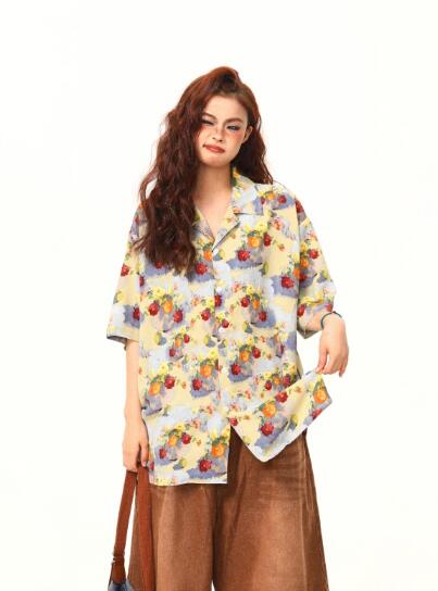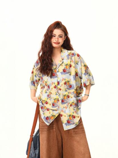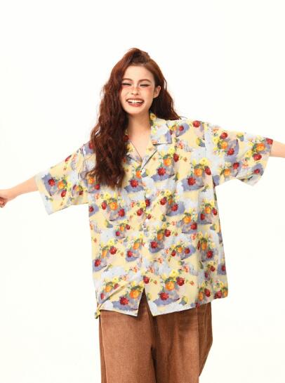レトロ花柄総柄半袖トップスシャツブラウス ビッグシルエット ゆめかわいい 奇抜 派手 ダンス 衣装 ヒップホップ コスチューム 大きいサイズ 服 原宿系オーバーサイズ レディースガールズきれい 個性的