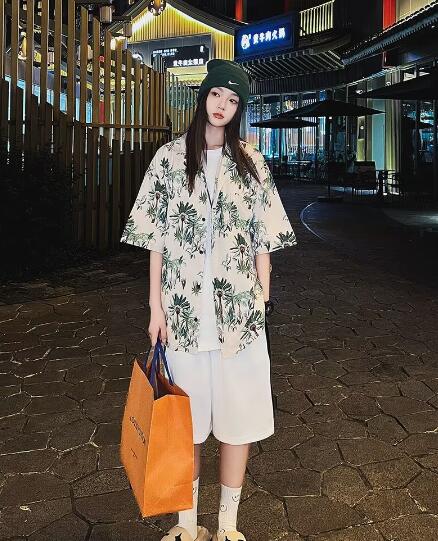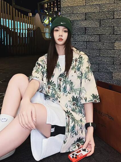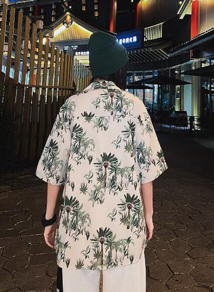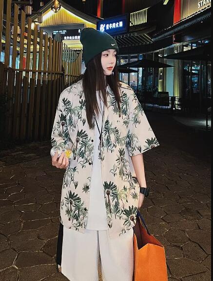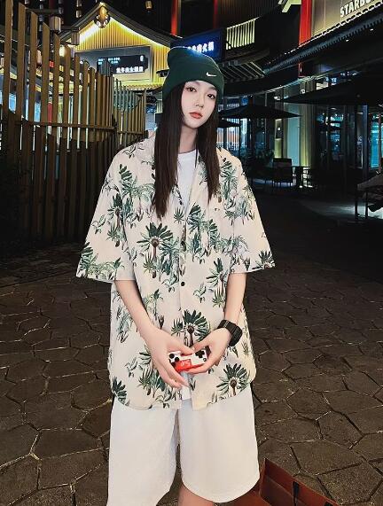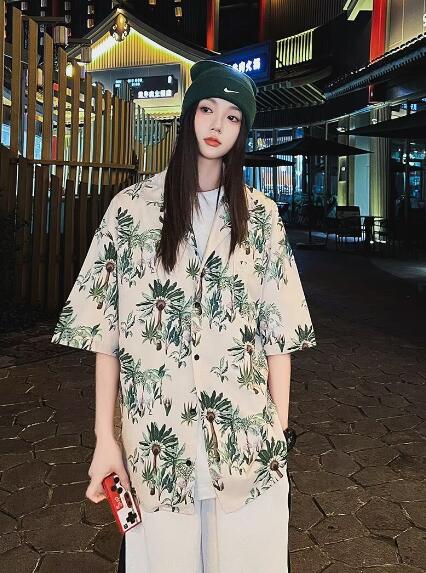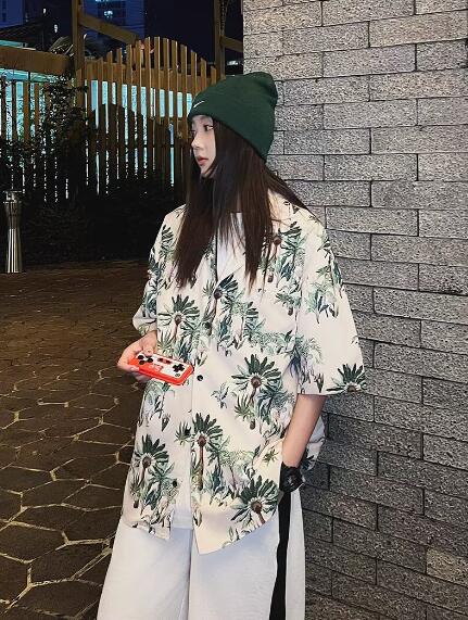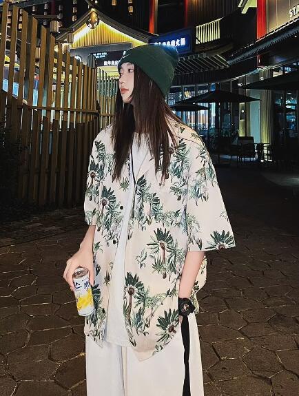ブラウス半袖シャツトップスカットソー前開きボタン大きいサイズビッグダンス衣装ヒップホップHIPHOPレディースメンズガールズストリート奇抜個性的韓国総柄柄シャツ派手