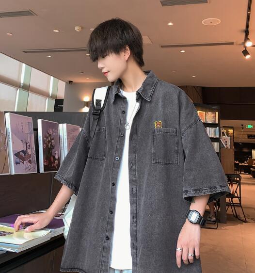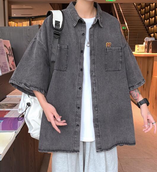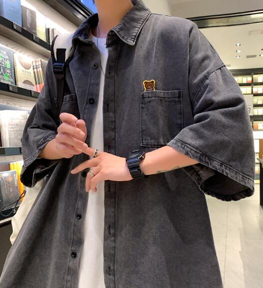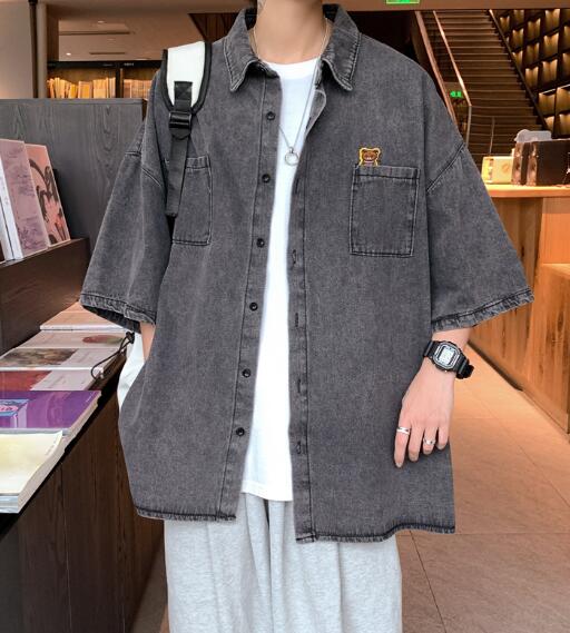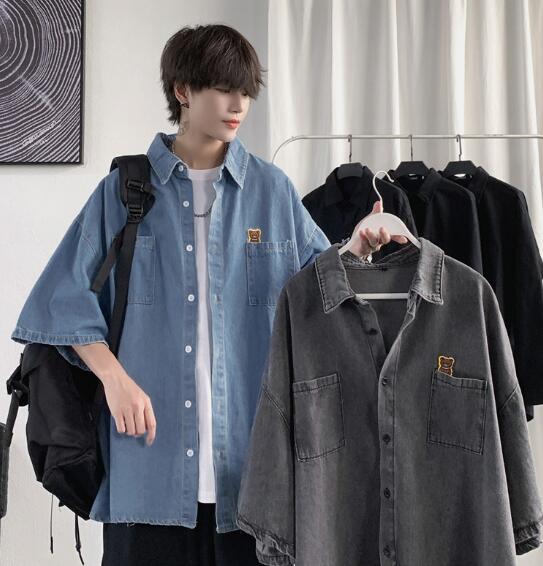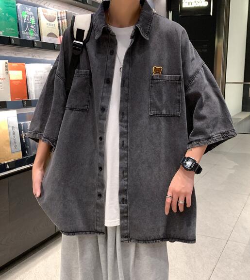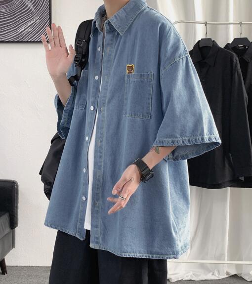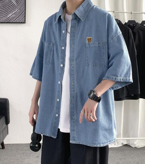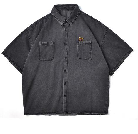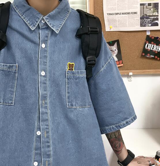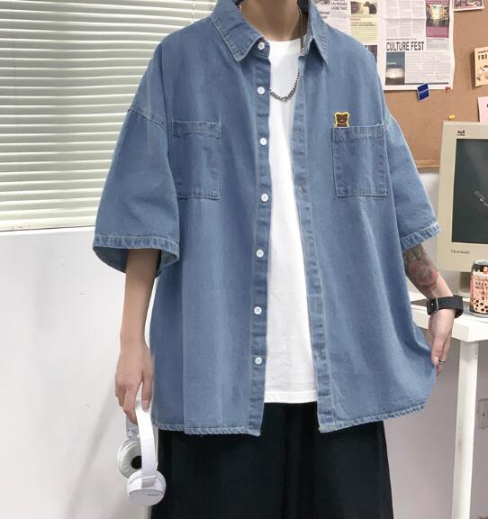 デニムブラウス半袖シャツトップスカットソー前開きボタン大きいサイズビッグダンス衣装ヒップホップHIPHOPメンズガールズストリート奇抜個性的韓国派手