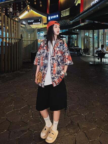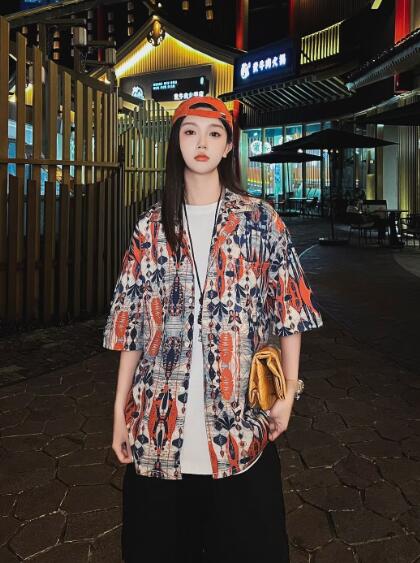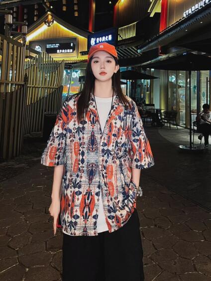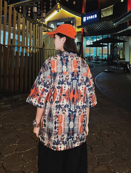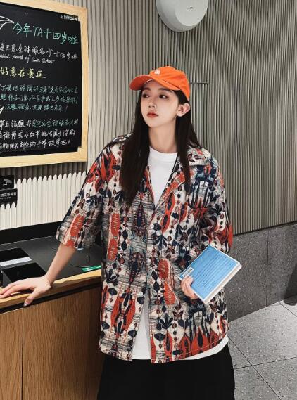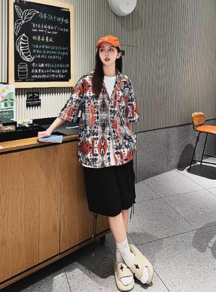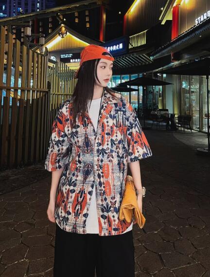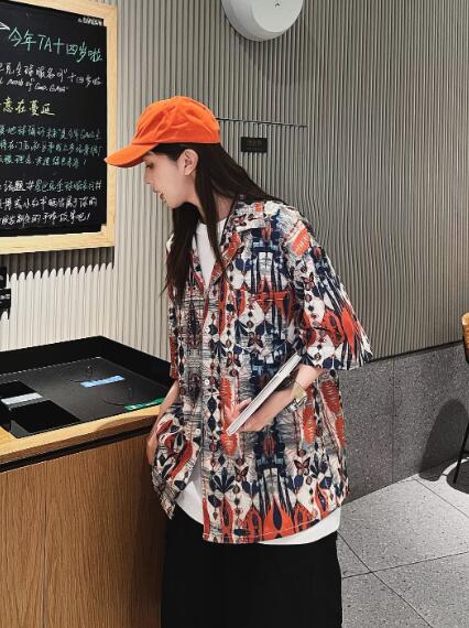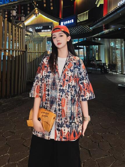 ブラウス半袖シャツトップスカットソー前開きボタン大きいサイズビッグダンス衣装ヒップホップHIPHOPレディースメンズガールズストリート奇抜個性的韓国総柄柄シャツ派手