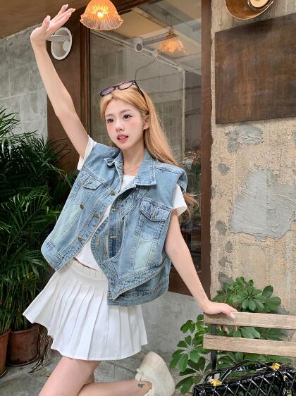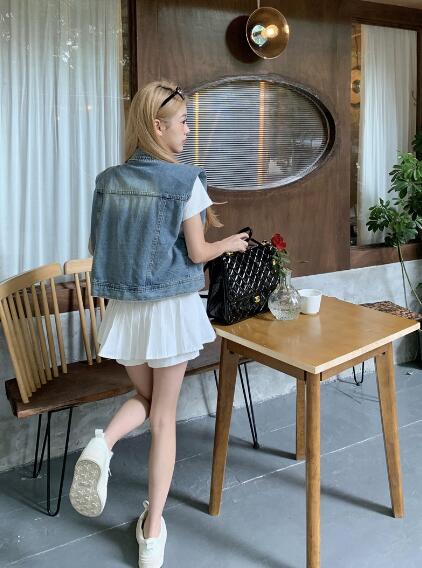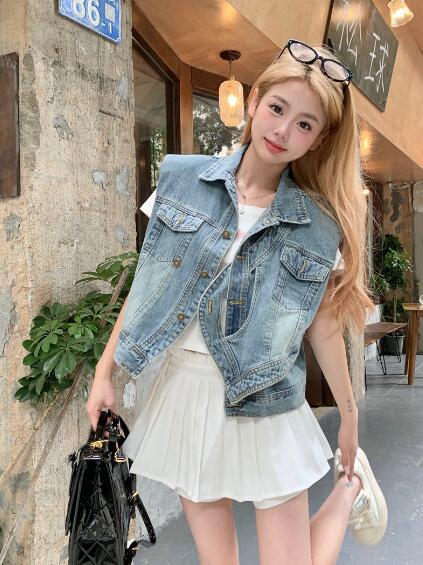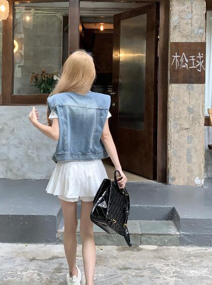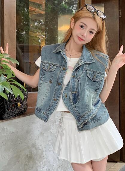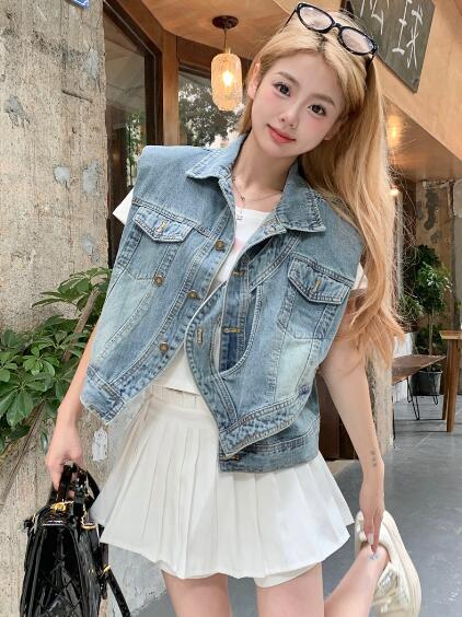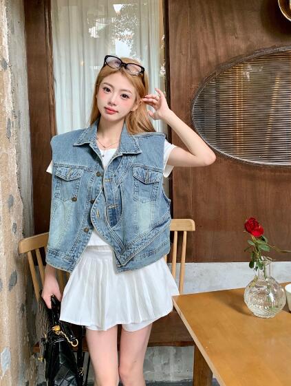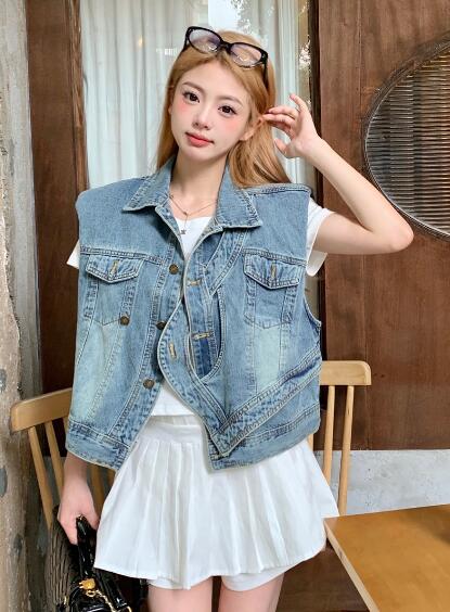 アシンメトリージージャンデニムジャケットベストGジャン青ブルーシンプルポケットビッグ大きいサイズダンス衣装ヒップホップHIPHOPレディースガールズ大人ストリートアウタージャンパー韓国おしゃれ
