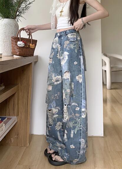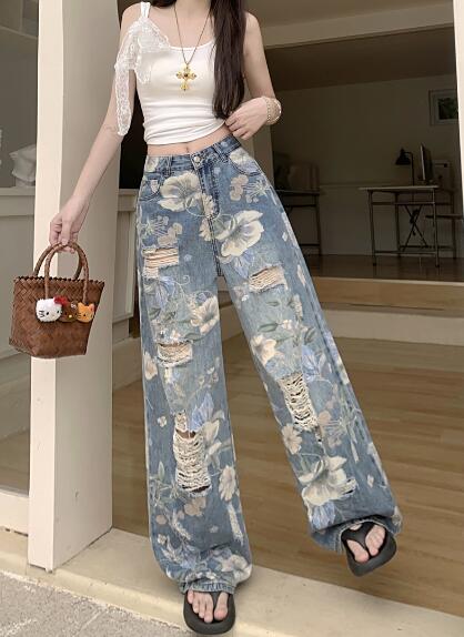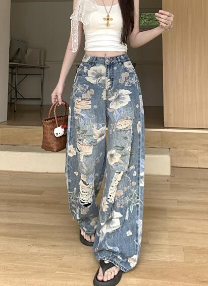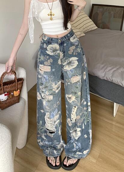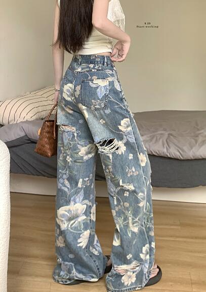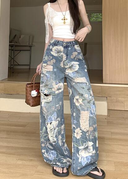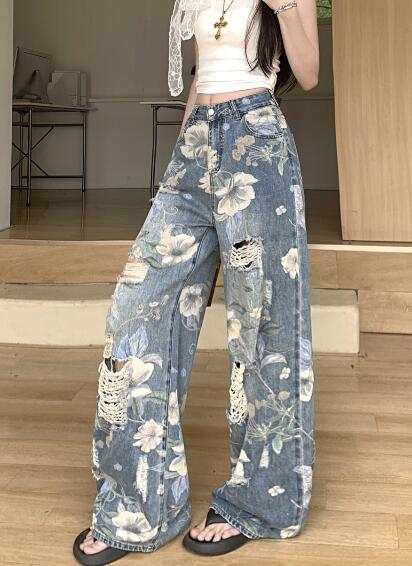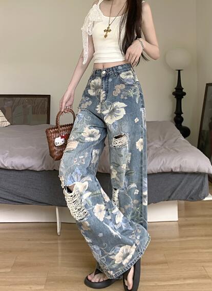 破れ加工ダメージ花柄総柄ジーンズジーパン パンツズボンボトムスポケットデニム太い太めダンス衣装ヒップホップHIPHOPレディースガールズストリート大きいサイズかっこいい個性的韓国ファッション