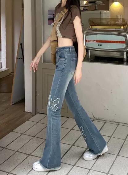 ちょうちょうフレアジーンズジーパン パンツズボンボトムスポケットデニム太い太めダンス衣装ヒップホップHIPHOPレディースガールズストリート大きいサイズかわいい個性的韓国ファッション