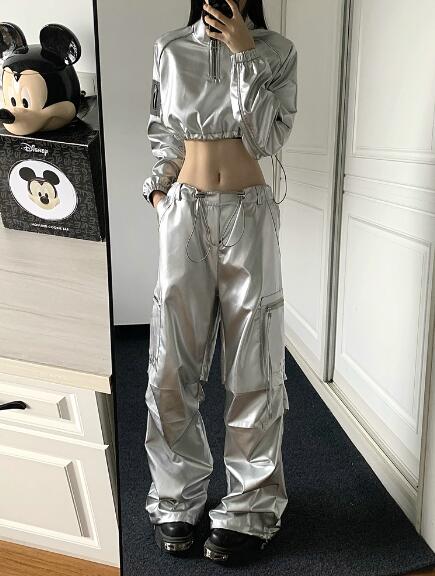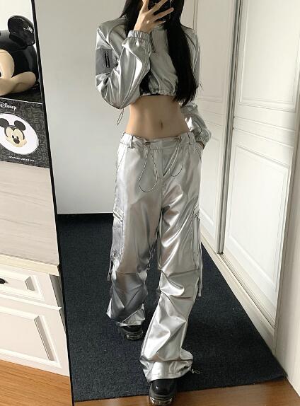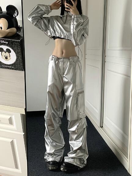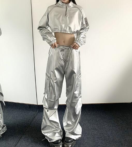 シルバーショート丈短い短め絞りトレーナー パーカートップス長袖大きいサイズビッグゆったりダンス衣装ヒップホップHIPHOPレディースガールズストリート個性的韓国ファッション