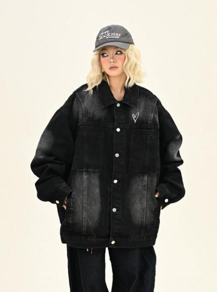 ハート刺繍ジージャンデニムジャケットアウター長袖 ビッグシルエット ゆめかわいい 奇抜 派手 トップス ダンス衣装 韓国ファッション 大きいサイズ 服 原宿系オーバーサイズ レディースメンズ 個性的