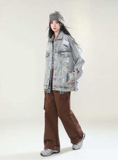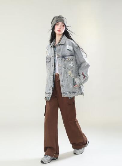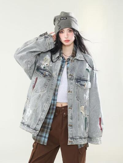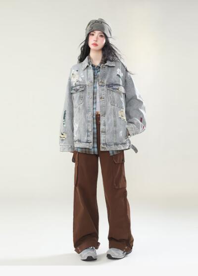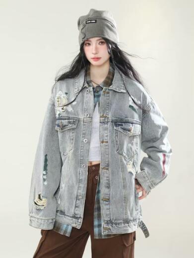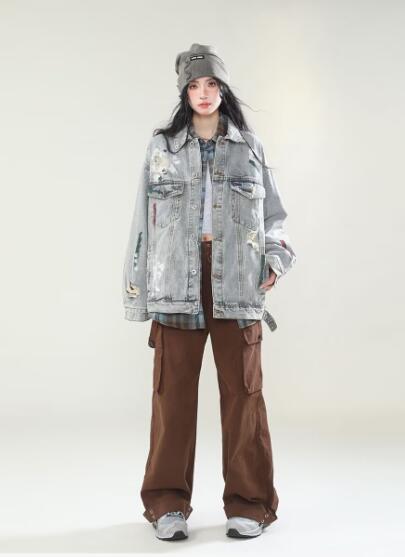 ダメージ破れ加工ジージャンデニムジャケットアウター長袖 ビッグシルエット ゆめかわいい 奇抜 派手 トップス ダンス衣装 韓国ファッション 大きいサイズ 服 原宿系オーバーサイズ レディースメ 個性的