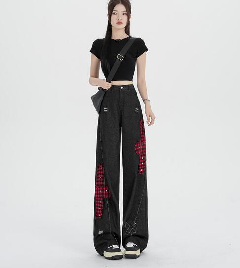 チェック柄ワッペンジーンズジーパン パンツズボンボトムスポケットデニム太い太めレディースガールズストリート大きいサイズおしゃれかわいい個性的韓国ファッション