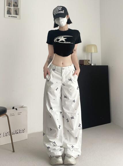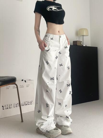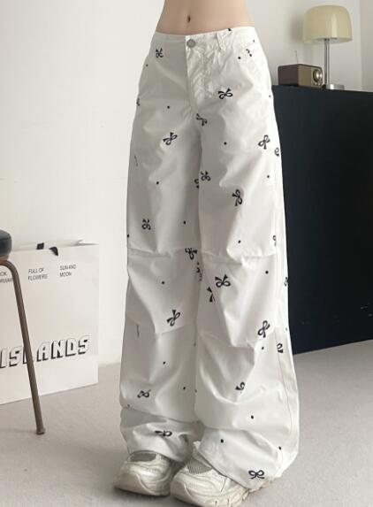 リボン柄総柄パンツズボンボトムス ロングワイド太い太め大きいサイズビッグゆったりハイウエストポケット裾絞りダンス衣装ヒップホップHIPHOPレディースガールズ個性的奇抜かわいい韓国ファッション