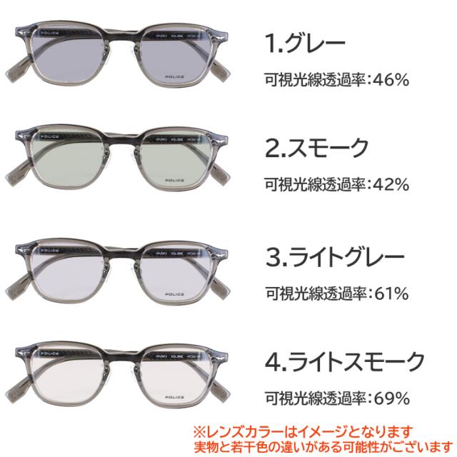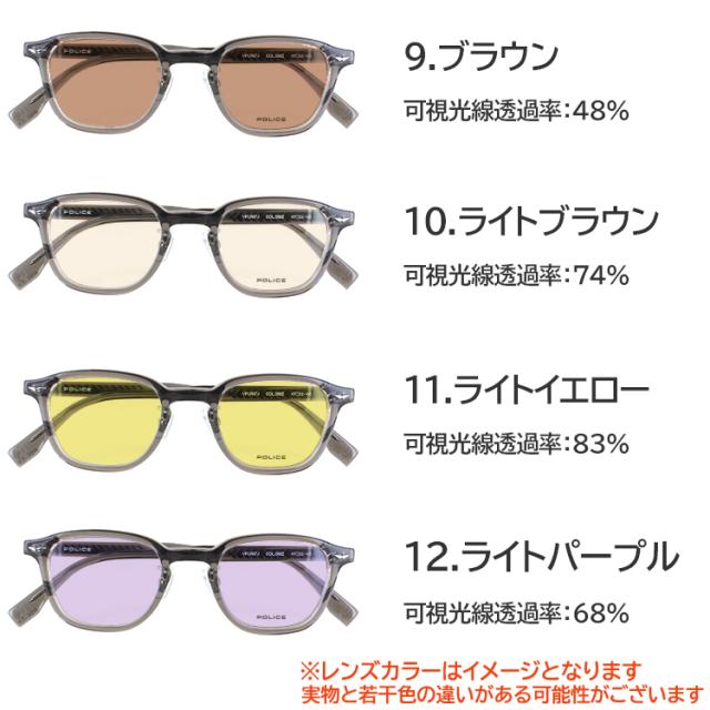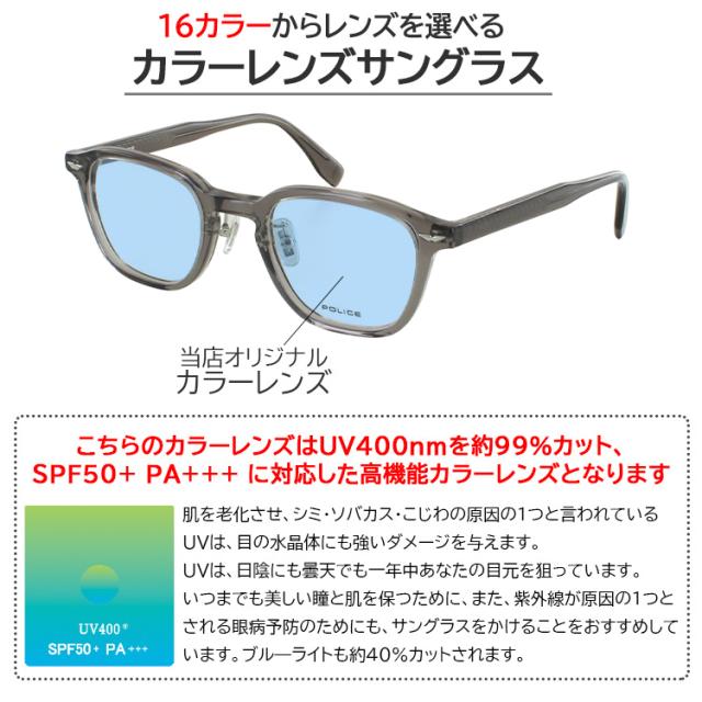 | 商品詳細 POLICE ポリスフレームのフレームに、 当店オリジナルカラーレンズを組み合わせた、サングラスです。 メンズ レディース 男女兼用モデル 2025年SSモデル ・丸みのある小ぶりなウェリントンシェイプ ・かける人を選ばないユニセックスなデザイン ・ヨロイに施したイーグルモチーフのメタルパーツがポイント ・カラーは洒落感のあるクリアなニュアンスカラーを4色ラインナップ ・アセテートから覗く、表裏模様入りのテンプル芯が特徴 ・しのみ先裏にゴシックPロゴ、さらに左表にはPOLICEロゴをそれぞれレーザーで配している ・クリングスパッド付きで快適なかけ心地 こちらのカラーレンズはUV400nmを約99%カット、 SPF50+ PA+++に対応した高性能カラーレンズとなります ブルーライトも約40%カット レンズカラーは16色の中からお選びいただけます。 <レンズカラー:可視光線透過率 > 1.グレー:46% 2.スモーク:42% 3.ライトグレー:61% 4.ライトスモーク:69% 5.ブルー:44% 6.ブルースモーク:50% 7.ライトブルー:61% 8.クリアブルー:78% 9.ブラウン:48% 10.ライトブラウン:74% 11.ライトイエロー:83% 12.ライトパープル:68% 13.グリーン:53% 14.ライトグリーン:71% 15.ライトピンク:76% 16.ライトオレンジ:75% | |