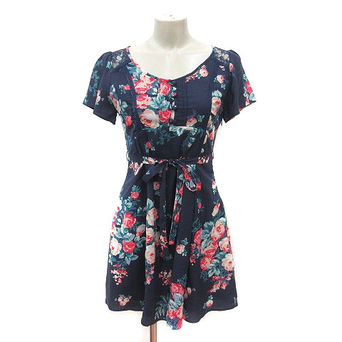 【中古】マーキュリーデュオ ワンピース ひざ丈 花柄 レース ウエストマーク 半袖 F 紺 ピンク 緑 レディース