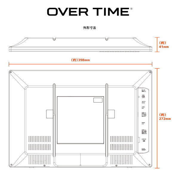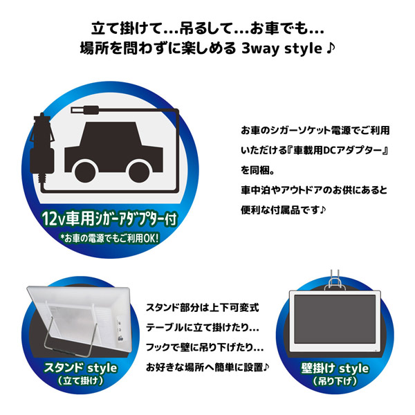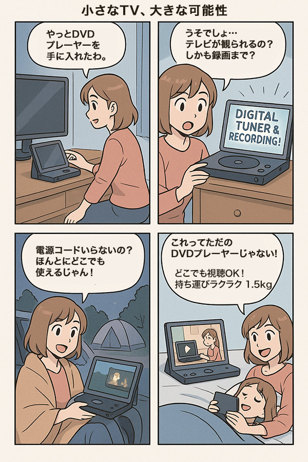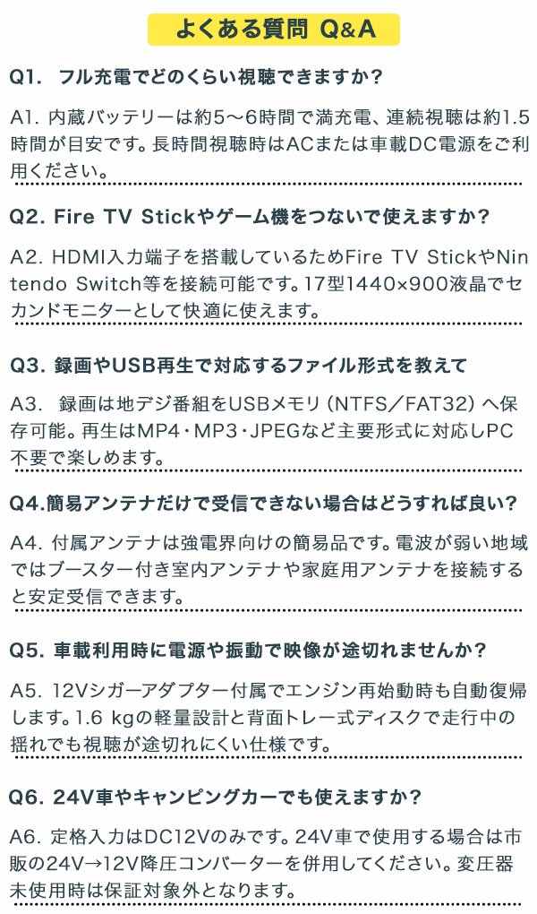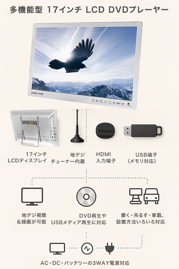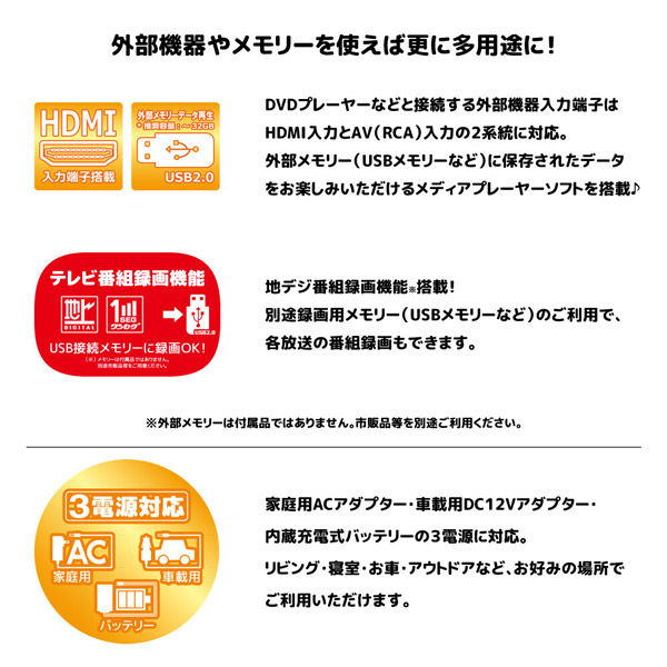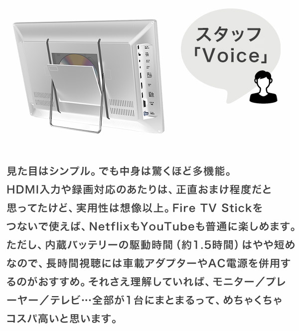 【DVDだけじゃないが正解】地デジチューナー搭載17型液晶付DVDプレーヤー 「これ…本当にDVDプレーヤー?」 初めて見た人は、きっとそう思うはず。 テレビが観られて、HDMIモニターにもなって、録画だってできる。 しかも、車でもアウトドアでも使えて、USBメモリに保存した動画や音楽まで再生できるなんて 正直、プレーヤーの常識、ひっくり返されました。 \地デジチューナー搭載17型液晶付DVDプレーヤーのここがポイント/ ■ 地デジチューナー内蔵:テレビ番組も録画もOK! ■ HDMI入力搭載:ゲームやFire TV Stickも映せるサブモニターに! ■ 3WAY設置対応:立て掛け・壁掛け・車載、どこでも自由に設置 → 「どこでもテレビ・動画環境」を、ひとつで完結できます 注目ポイント1:HDMI入力でもう1台のモニターに早変わり HDMI端子が付いてるから、ゲーム機やPC、ストリーミングデバイスをつないでサブモニターにも使えます。 しかも17インチの高精細液晶(1440×900)で、画質も見やすい。 「作業しながらサブ画面で動画を流す」「家族がテレビを占領中でも別画面でゲーム」 これ、もうセカンドテレビです。 注目ポイント2:録画も再生もUSBで簡単に 外付けメモリー(USB)を挿すだけで、録画した地デジ番組が保存できる。 さらに、保存済みの動画・音楽・画像ファイルを再生できるメディアプレーヤー機能も内蔵。 対応形式はMP4/MP3/JPEGなど定番系をしっかり網羅。 旅先で子どもの動画を流したり、車中でお気に入りの音楽を聴いたり——活躍シーンは無限大です。 注目ポイント3:3WAY設置&3電源対応でどこでもテレビに 立て掛け・吊り下げ・車載、全部対応。 さらに、AC/DC/バッテリーの3電源で、どこでも視聴OK。 車中泊で夜に映画を見る。 寝室でラジオ代わりにテレビをつける。 屋外イベントで録画した映像を流す。 これ1台で、場所も使い方も選びません。 注目ポイント4:本体1.6kg!持ち運びしやすいコンパクト設計 約1.6kgの軽量ボディだから、車への持ち込みもラク。 壁掛けフックに掛けても負担にならないサイズ感。 しかも、背面トレー式ディスクで省スペース設計。 置く場所に困らず、好きなところにすぐセットできます。 【実際に使ってみた】 車中泊で使ってみました。 子どもが静かにアニメを観てる間に、私はサブモニターでスマホの画面をミラーリングして作業。 録画しておいた番組もUSBから再生できて、思った以上に便利! 車内でも、リビング感覚で動画ライフを楽しめました。 「正直、これ一台で何役こなすの…?」という驚き。ガチで手放せなくなってます。 【スタッフVoice】 見た目はシンプル。でも中身は驚くほど多機能。 HDMI入力や録画対応のあたりは、正直おまけ程度だと思ってたけど、実用性は想像以上。 Fire TV Stickをつないで使えば、NetflixもYouTubeも普通に楽しめます。 ただし、内蔵バッテリーの駆動時間(約1.5時間)はやや短めなので、長時間視聴には車載アダプターやAC電源を併用するのがおすすめ。 それさえ理解していれば、モニター/プレーヤー/テレビ…全部が1台にまとまるって、めちゃくちゃコスパ高いと思います。 こんな人におすすめ! 「テレビも見たいし、DVDも観たいし、USBも使いたい…!」という欲張り派 サブモニターや車中用などマルチに使える1台を探してる人 「どこでも観れる」が叶うTV・DVDプレーヤーを探してた! 今すぐ、“どこでも観れる自由”をあなたの手に。 テレビも、DVDも、録画も、USB再生も 「それ全部やりたいけど、置く場所もないし…」と諦めていた人にこそ、この一台を届けたい。 サブモニターとしても、車中泊の相棒としても、寝室用のテレビとしても活躍する DVDプレーヤーの皮をかぶったマルチメディア端末。 スペースも、使い方も、あなた次第で自由自在。 この価格帯でここまでできるモデルは、正直かなりレアです。 在庫があるうちに、ぜひチェックしてみてください。 【商品特徴・キーワード】 ポータブルテレビ 17インチ 液晶テレビ 録画機能付き バッテリー内蔵 地デジ対応 DVD再生機能付き HDMI端子付き USB録画対応 車載用アダプタ付き 軽量 1.6kg 1440×900 解像度 LEDバックライト TFT液晶 キャンピングカー対応 アウトドア用 車中泊向け 災害用 価格比較 コンパクト # 17インチ ポータブルテレビ 商品仕様 ## 基本仕様 ### サイズ・重量 - **本体サイズ**: 約398×272×41mm - **本体重量**: 約1.6kg(バッテリー含む) ### 電源 - **本体定格**: DC12V 2.0A - **ACアダプター**: AC100V~240V 50/60Hz - **消費電力**: 24W(待機時:約1W) - **設置環境**: 温度0℃~40℃(結露なきこと) ### 内蔵充電池 - **仕様**: Li-PO 7.4V 3000mAh 22.2Wh - **充電時間**: 約5〜6時間 - **駆動時間**: 約1.5時間程度 ## 液晶パネル・音響 ### 液晶 - **サイズ**: 17型TFT/LEDバックライト - **解像度**: 1440×900RGB ### スピーカー - **出力**: 3W×2 ## 入出力端子 - 電源入力 - HDMI入力 - AV入力 - イヤホン出力 - miniB-CASスロット - アンテナ入力 ## インターフェース - **メディアプレーヤー用ポート**: USB-TypeA(2.0) - **地デジ録画用ポート**: USB-TypeA(2.0) - **対応フォーマ