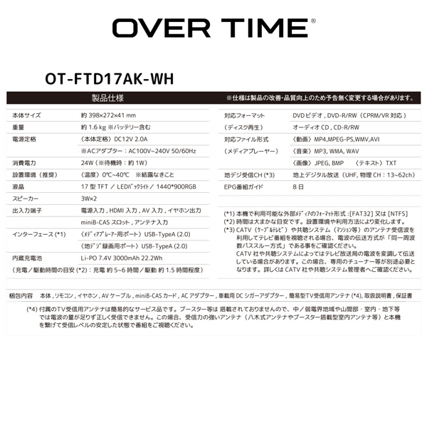 ポータブルテレビ 17インチ 地デジ録画 HDMI入力対応 3電源 車載OK DVDプレーヤー OT-FTD17AK-WH