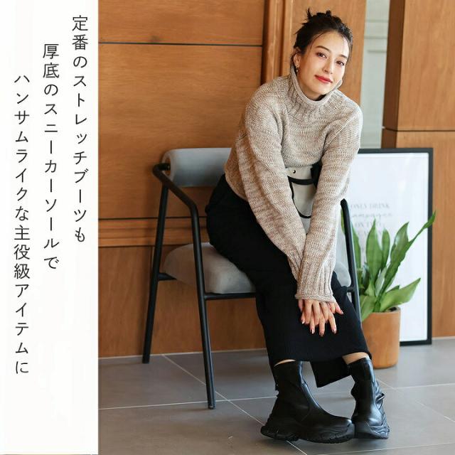 定番のストレッチブーツも厚底のスニーカーソールでハンサムライクな主役級アイテムに。