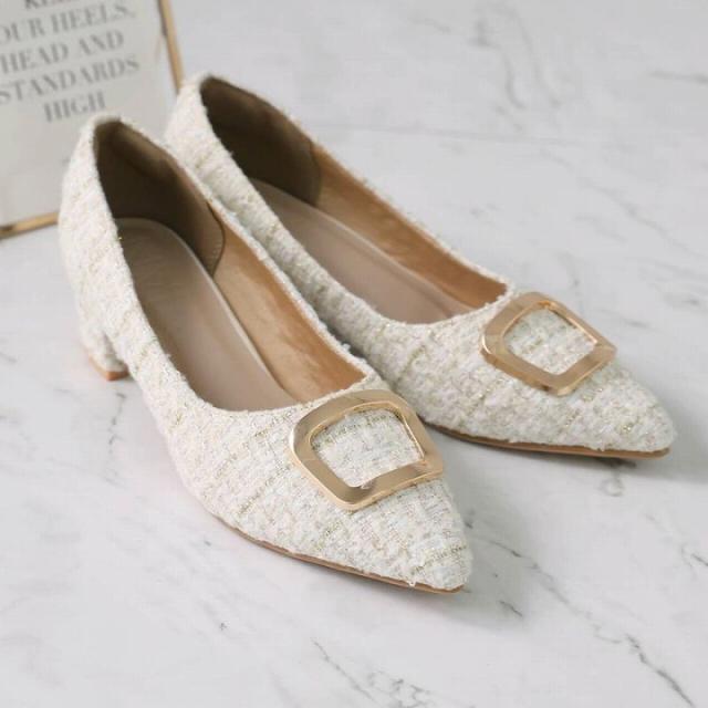 ポインテッドトゥ×ブロックヒールで甘くなりすぎない上品フォルム。