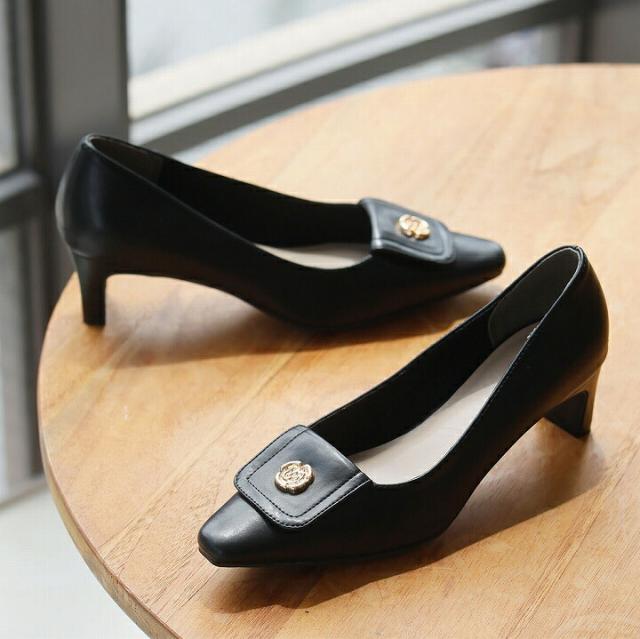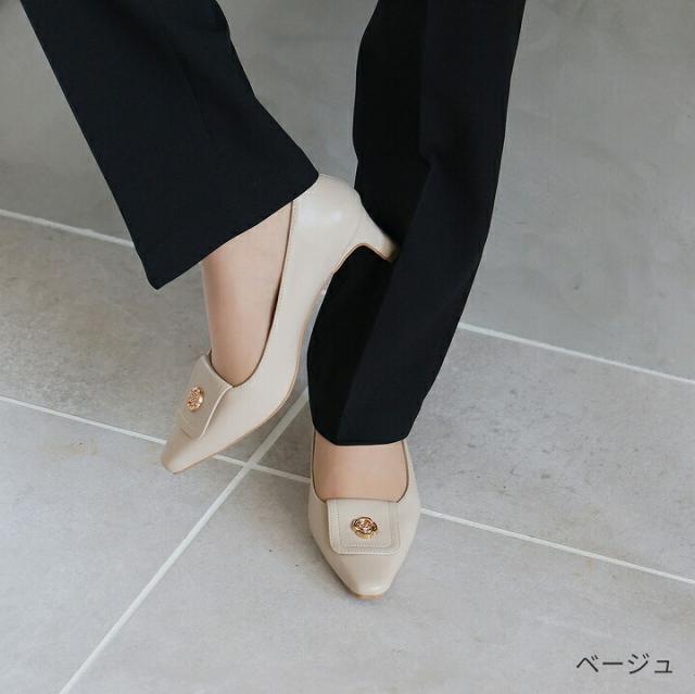 スクエアトゥゴールドパーツプレートヒールパンプス