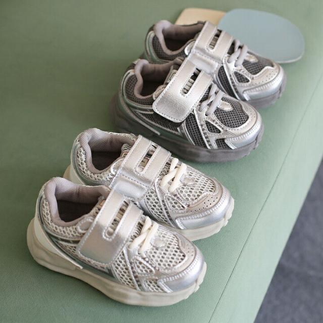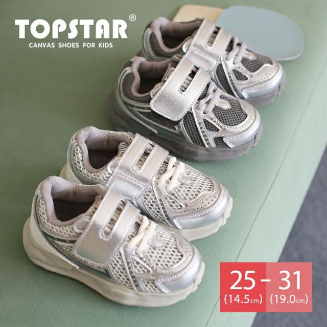 キッズ スニーカー キッズシューズ TOPSTAR 14.0cm-19.0cm スニーカー キッズ ジュニア 子供靴 男の子 女の子 運動会 運動靴 マジックテープ メッシュ メタリック シルバー グレー T6008AL