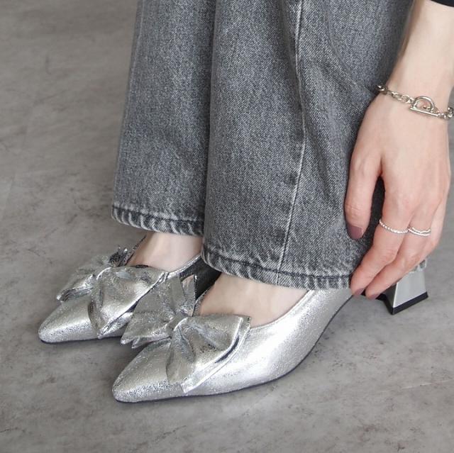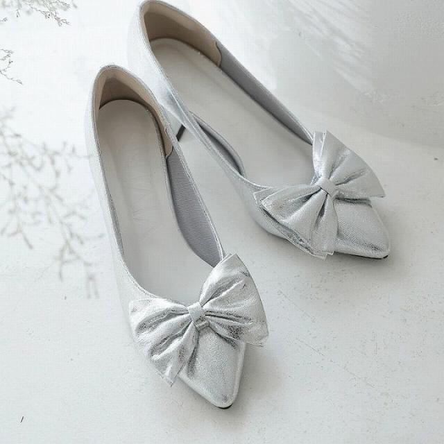 【店内全品10%OFFクーポン】パンプス 痛くない 歩きやすい 結婚式 同窓会 疲れにくい 走れる セレモニー シルバー 6cm チャンキーヒール リボン モチーフ ポインテッドトゥ ZOZO V6041AL