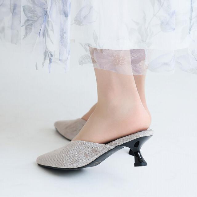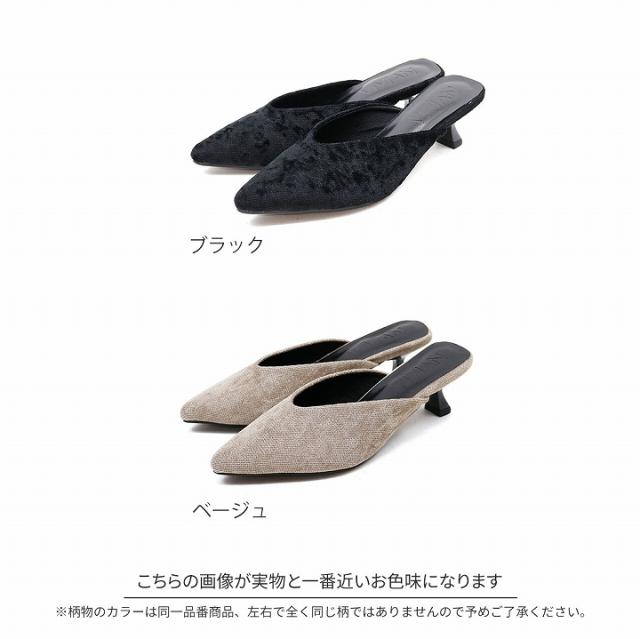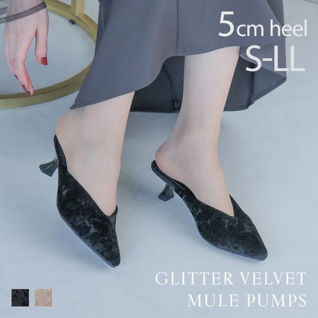 ミュール ポインテッドトゥ ベロア ラメ 5cm 細ヒール ブラック 黒 ベージュ 大きいサイズ 小さいサイズ 22cm 22.5cm 23cm 23.5cm 24cm 24.5cm 20代 30代 40代 50代 60代 結婚式 二次会 通勤 オフィス カジュアル Minkyme Minky me