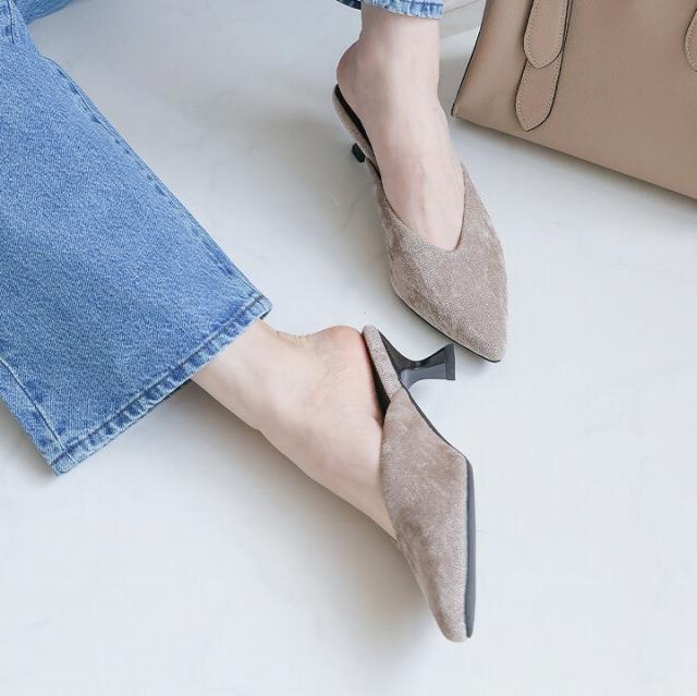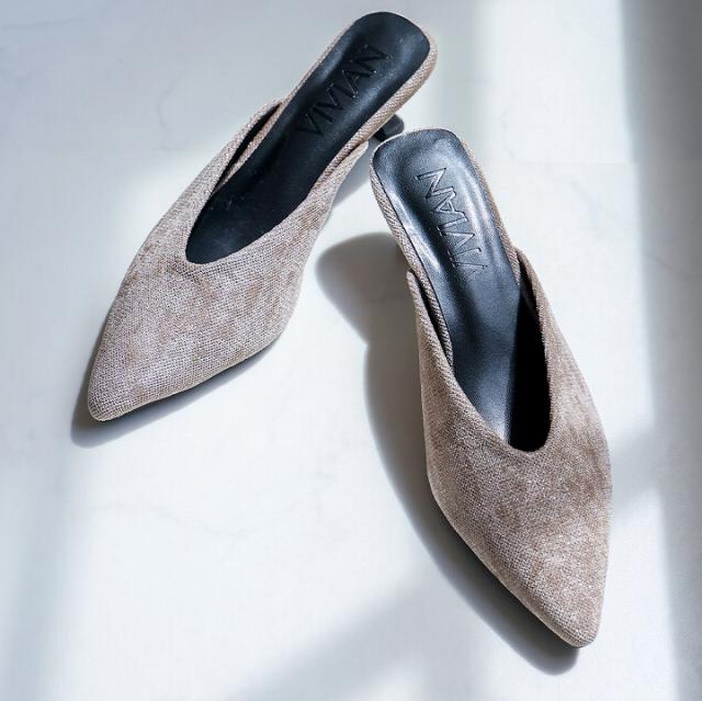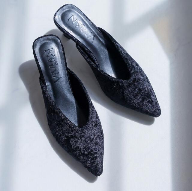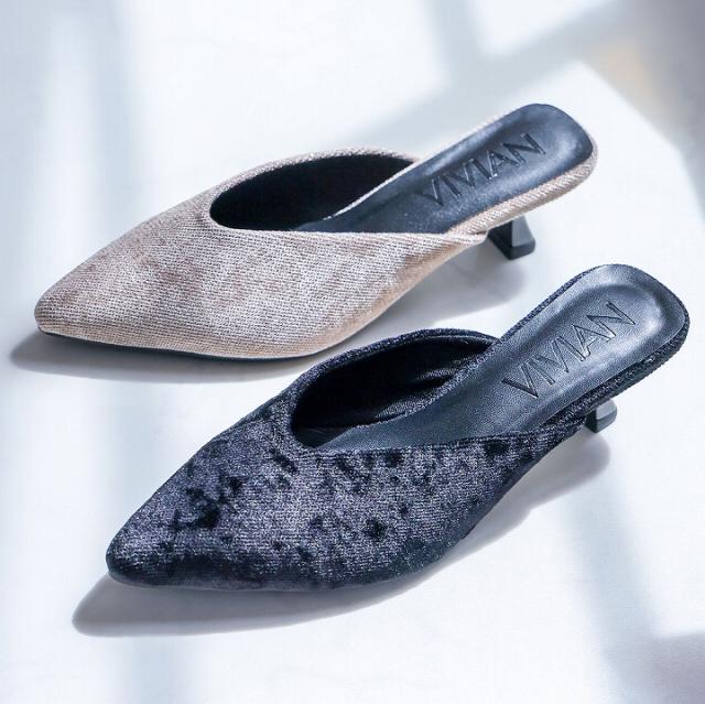 予約 サンダル レディース VIVIAN ミュール ポインテッドトゥ ベロア ラメ 5cm 細ヒール ブラック 黒 ベージュ V3345AL