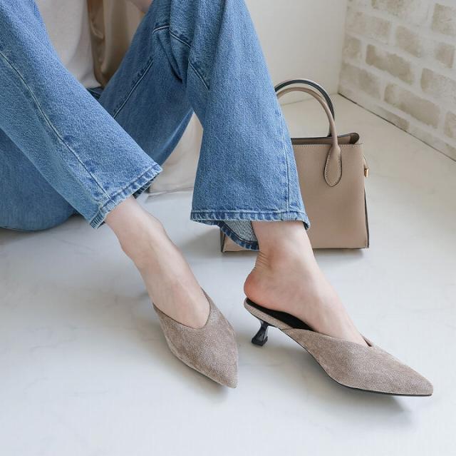・ポインテッドトゥ×艶のあるくびれ斜めヒールで甘くなりすぎない上品フォルム