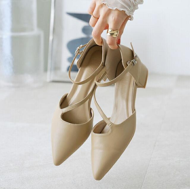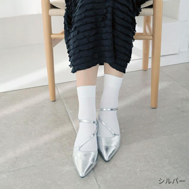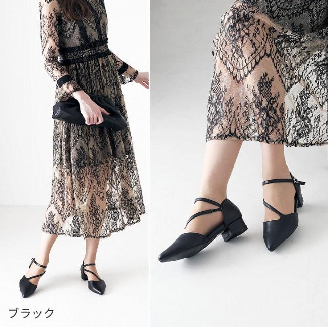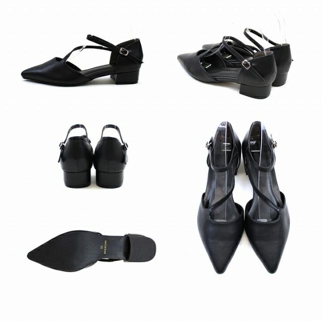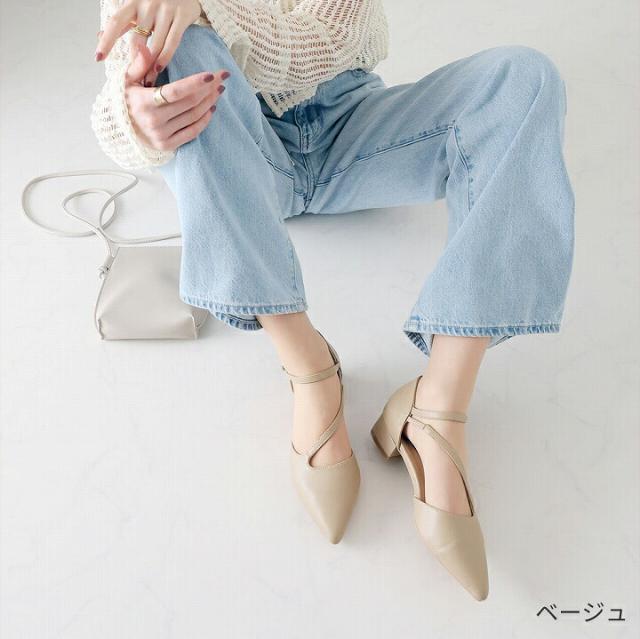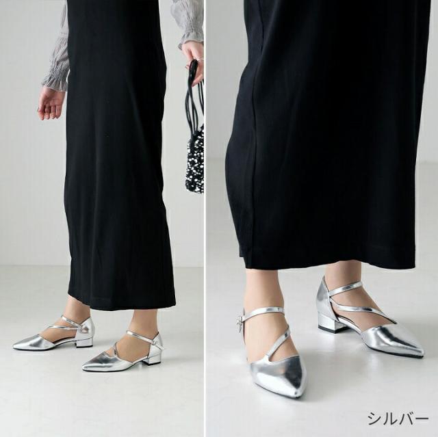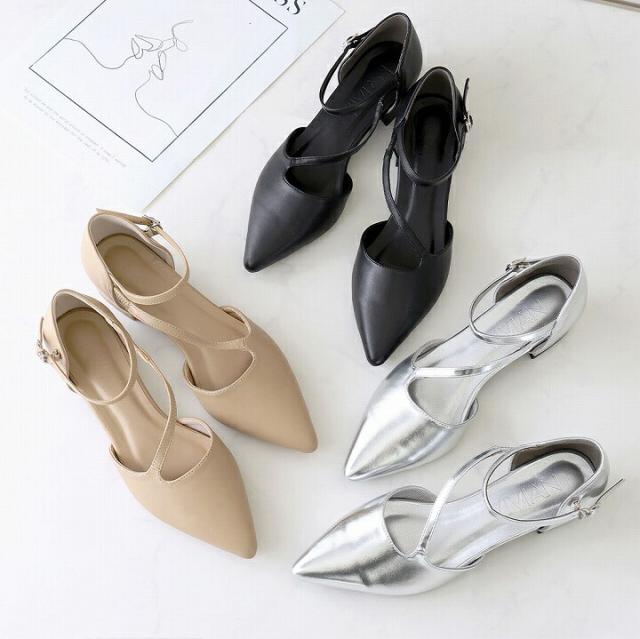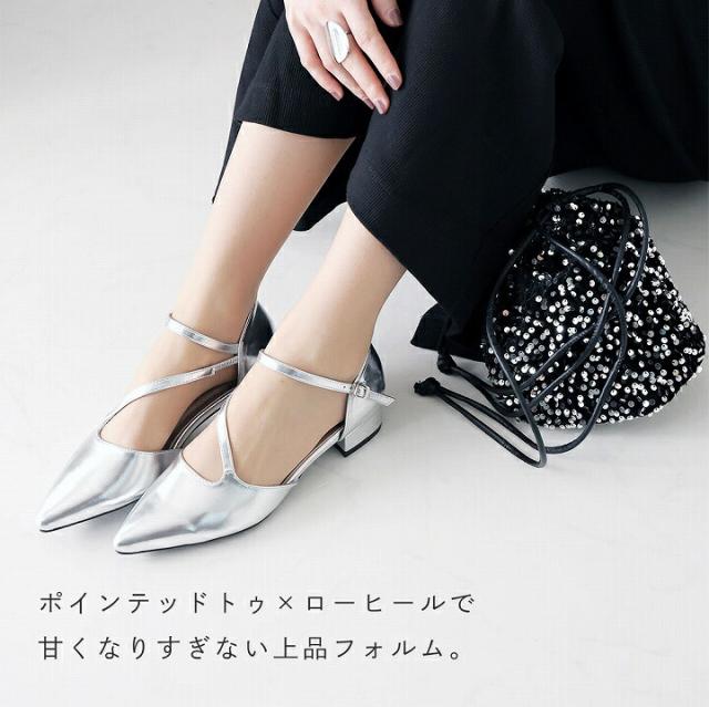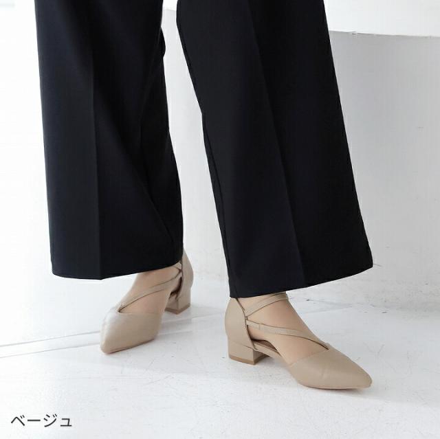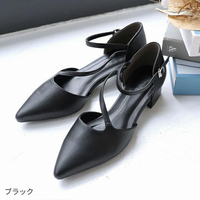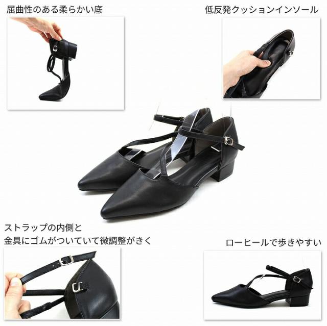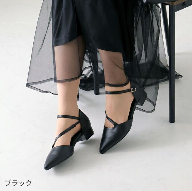 ポインテッドトゥ斜めストラップローヒールセパレートパンプス