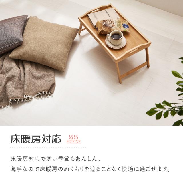 インテリアの邪魔をしない、クリア素材のダイニングラグ。床面が透けて見えるため圧迫感がなく、お部屋の雰囲気はそのままに床をしっかり守ります。抗菌効果(抗菌試験で黄色ブドウ球菌や大腸菌が繁殖しにくい検査を通過)で衛生面も安心。耐水性に優れたPVC素材でお手入れしやすく、汚れの気になるキッチンやダイニングなどに。スペースに合わせて自由にカットしてもお使いいただけます。床暖房にも対応しており、約1.2mmと薄手のため床暖房のぬくもりを遮ることなく快適に過ごせます。