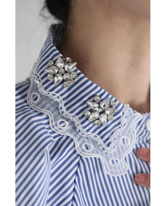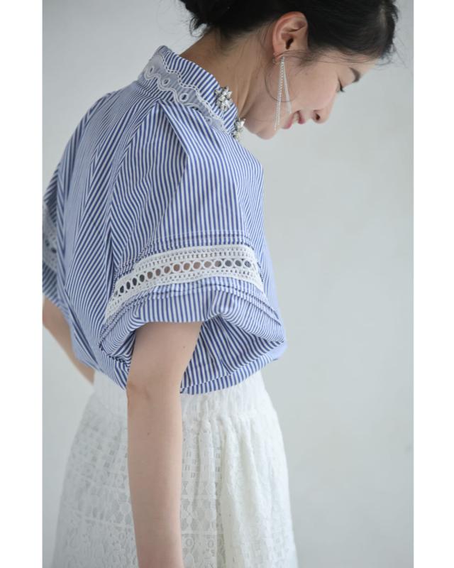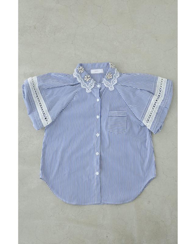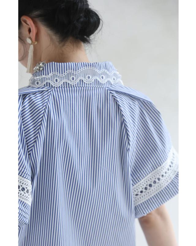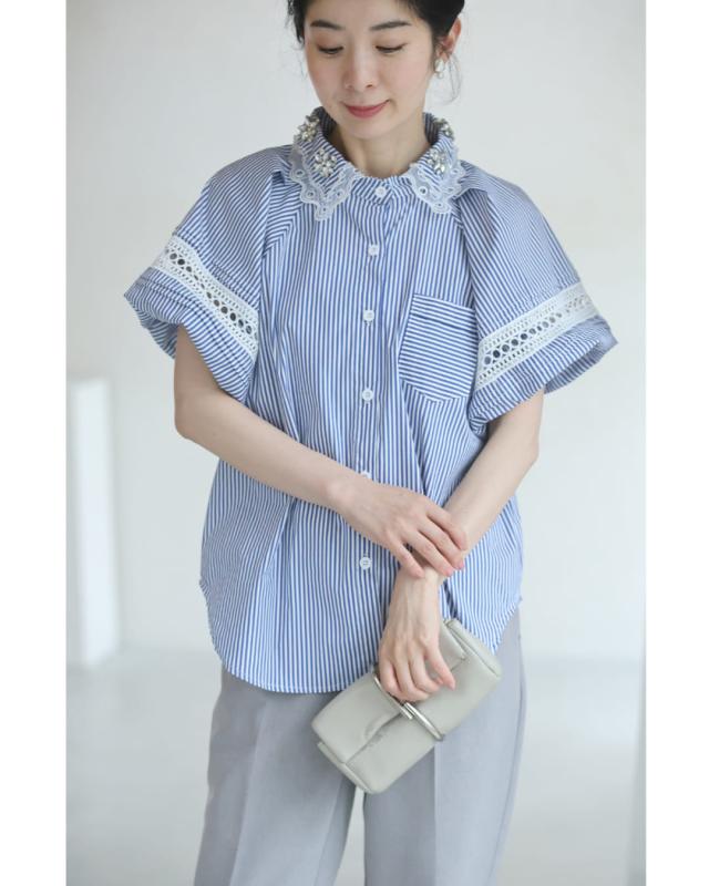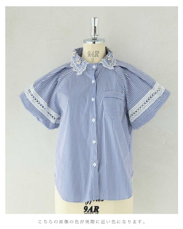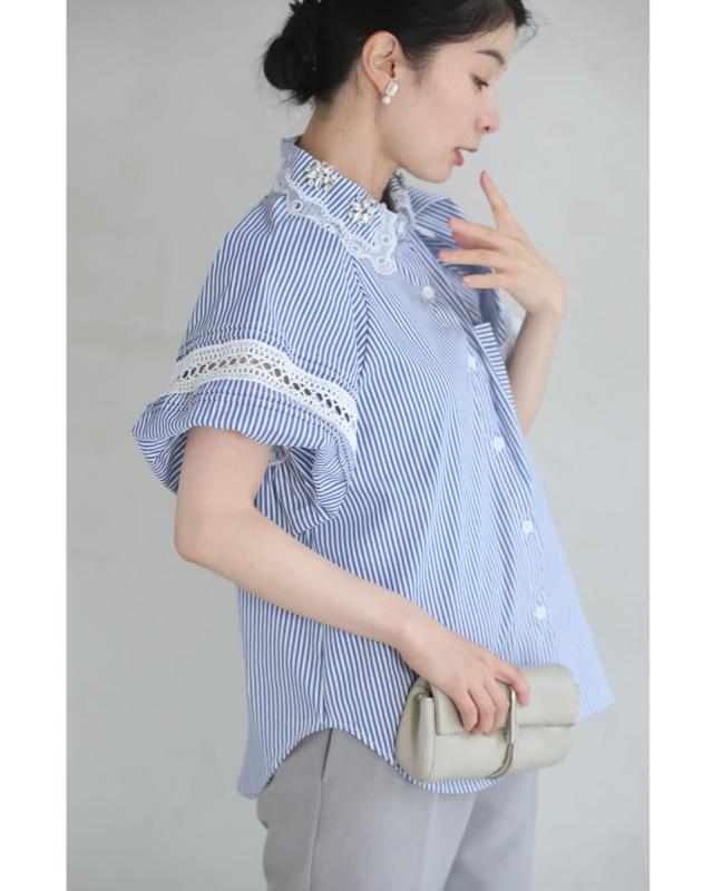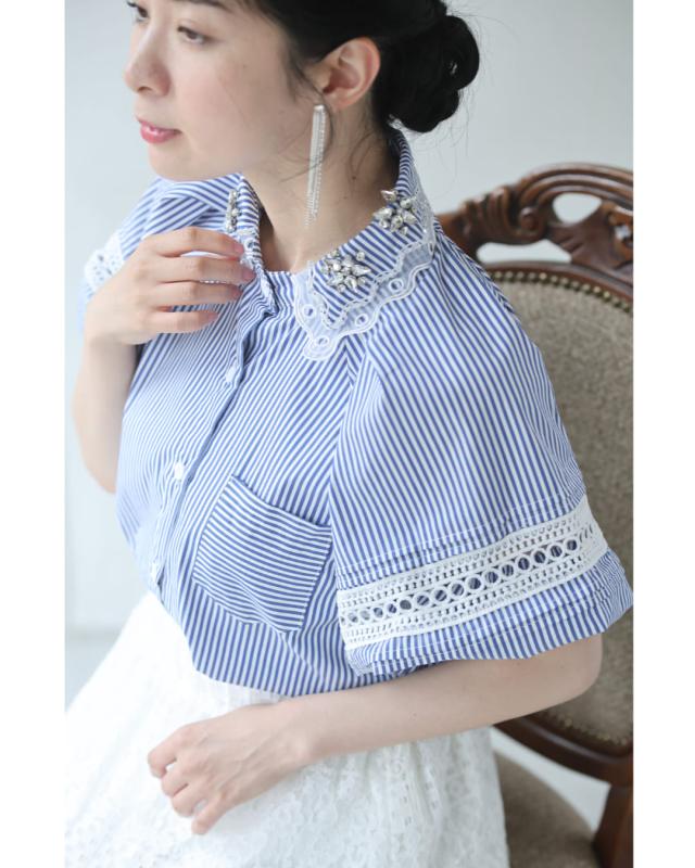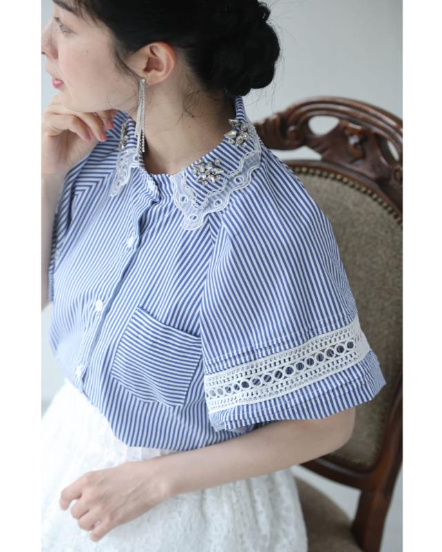 再入荷8月4日 首元に輝くビジュー花襟のポワン袖ストライプシャツトップス cawaii w61342ps S~L対応 半袖 装飾 レース 華やか 総柄 ブルー オシャレ 個性的 大人可愛い エレガント 上品 春 夏 薄手 レディース ファッション ミセス 30代 40代 50代