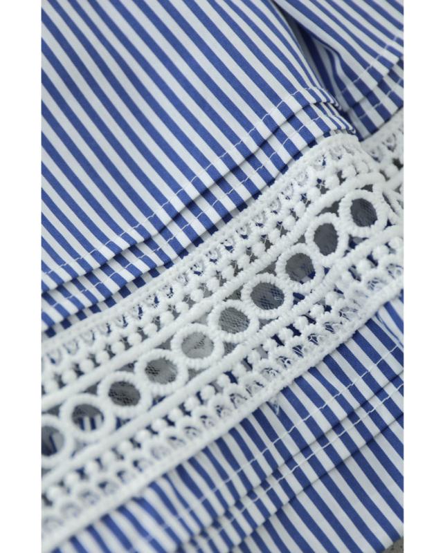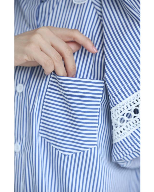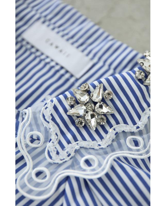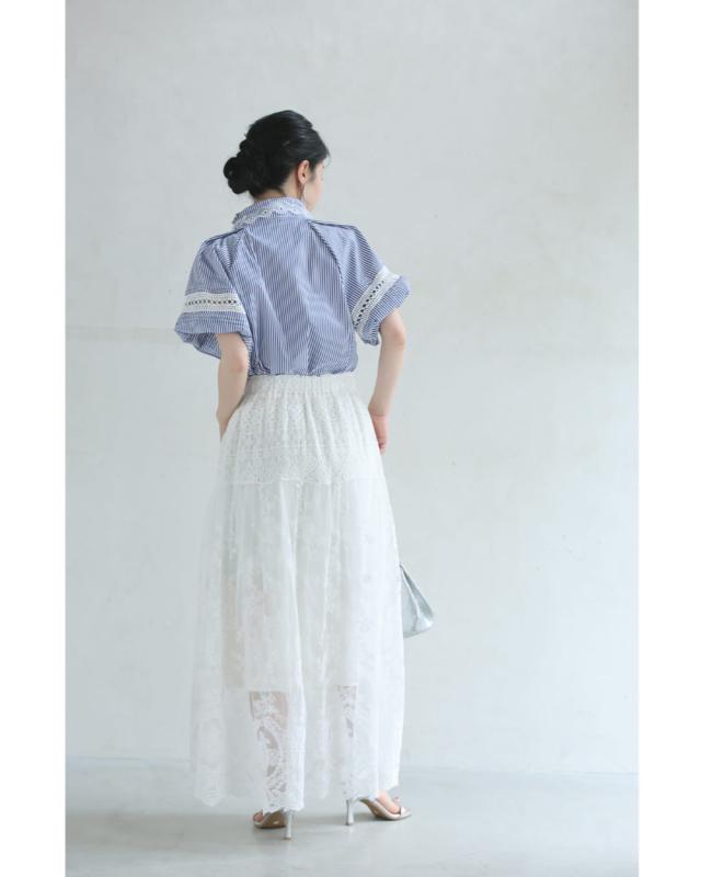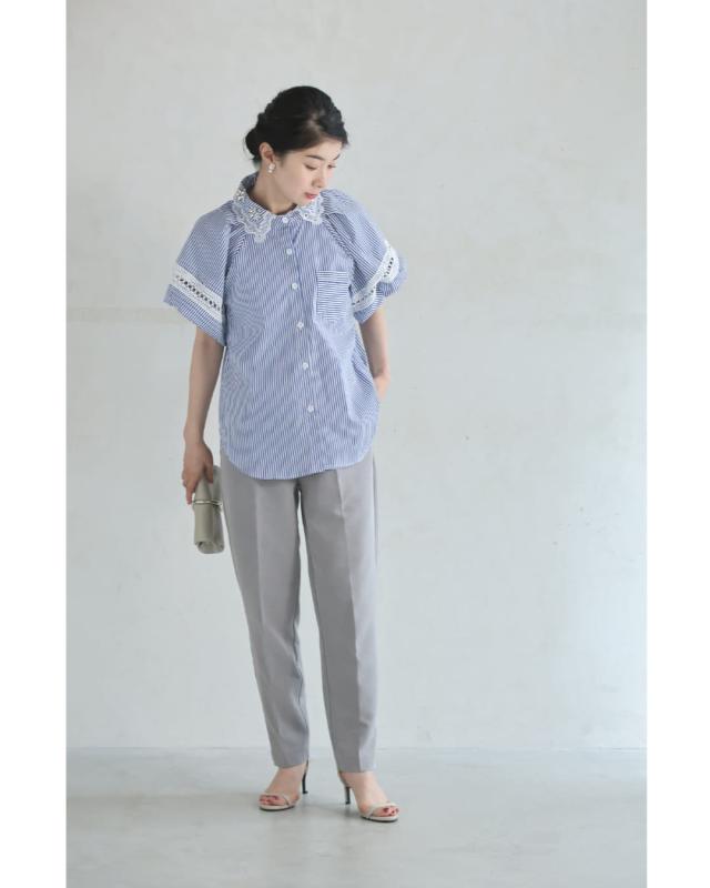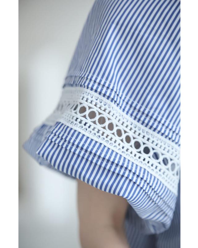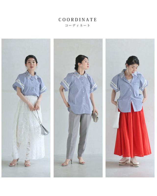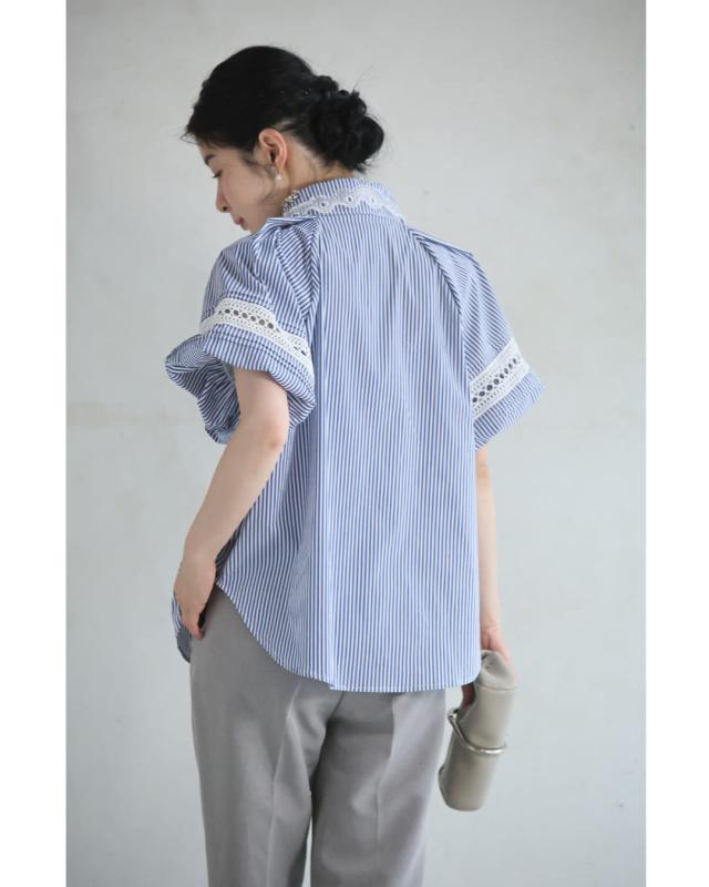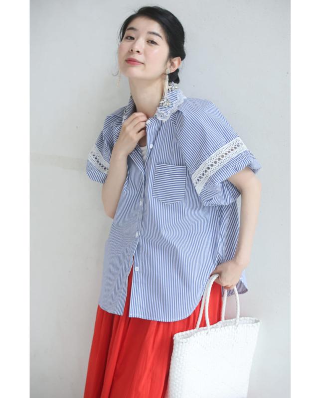 再入荷8月4日 首元に輝くビジュー花襟のポワン袖ストライプシャツトップス cawaii w61342ps S~L対応 半袖 装飾 レース 華やか 総柄 ブルー オシャレ 個性的 大人可愛い エレガント 上品 春 夏 薄手 レディース ファッション ミセス 30代 40代 50代