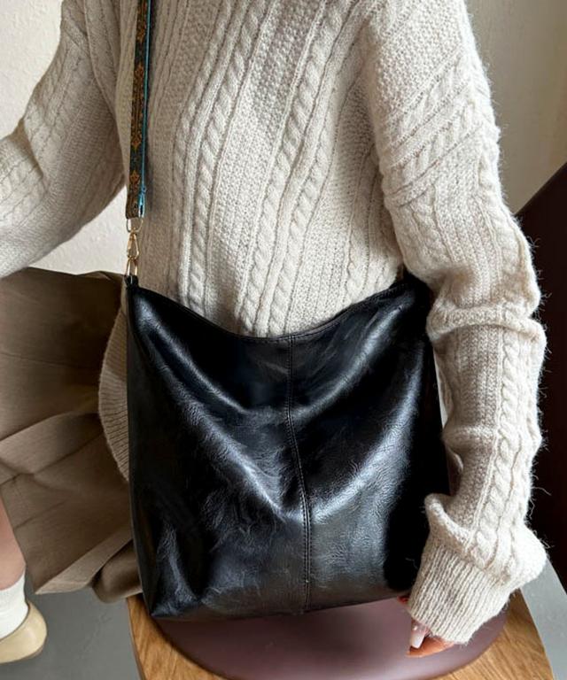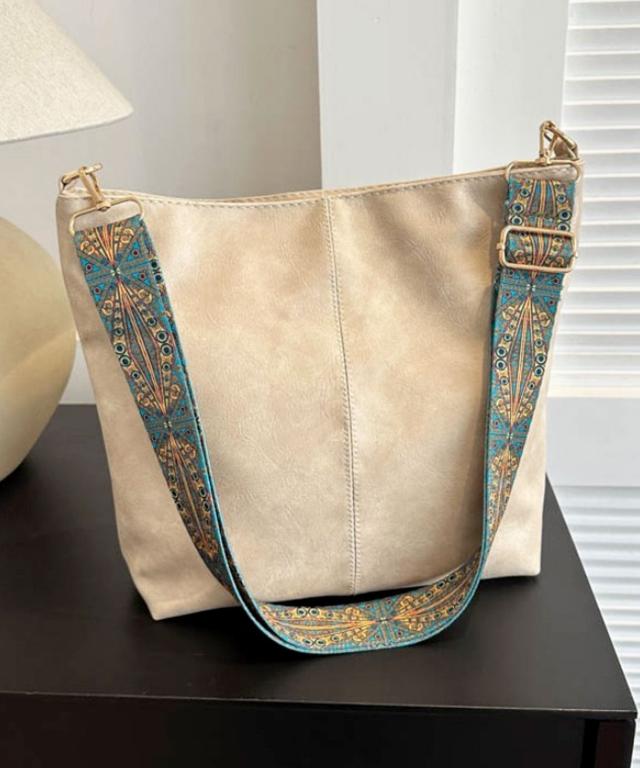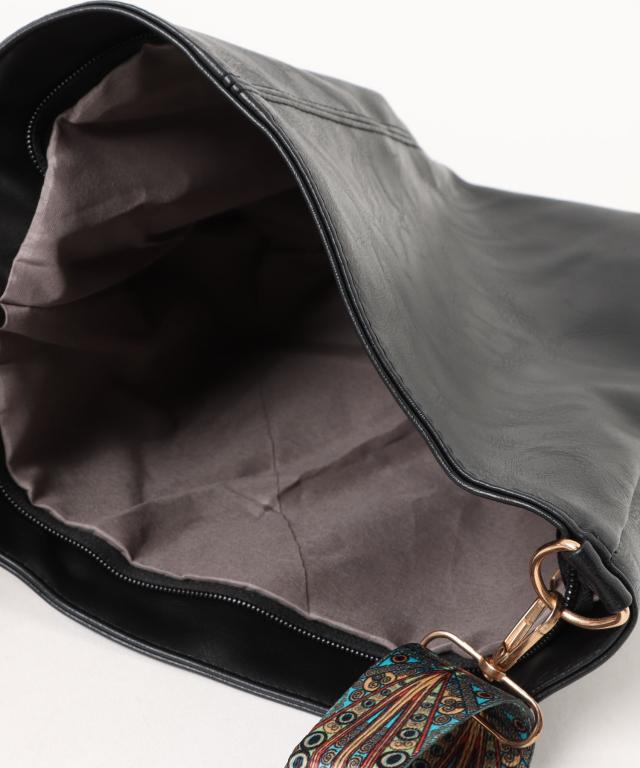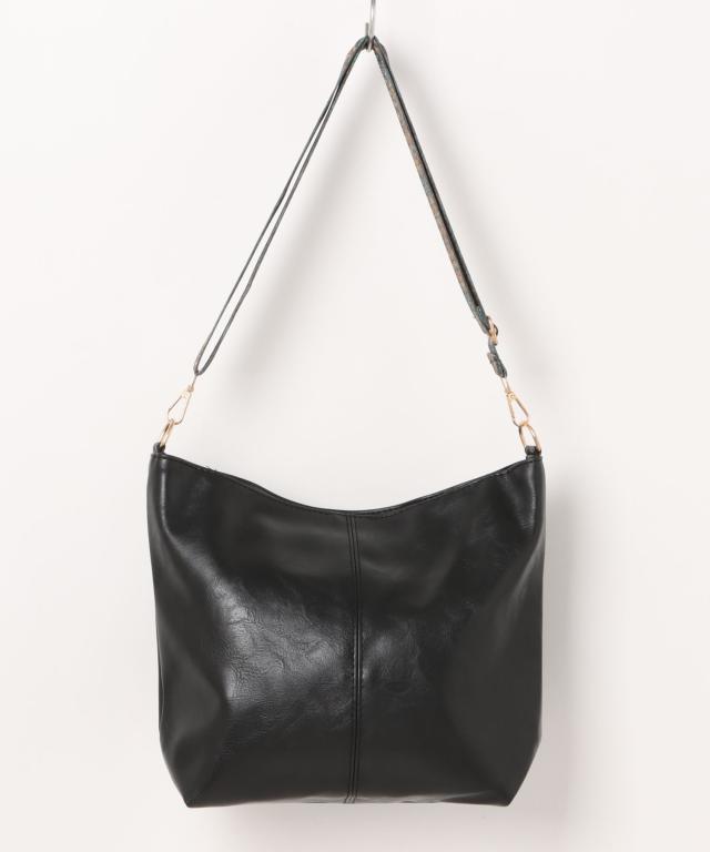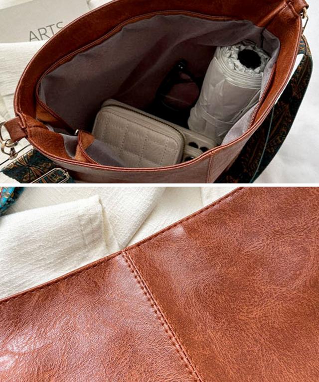 ソフトなムラ染めPUレザーにエスニック調のショルダーストラップを組み合わせたおしゃれなショルダーバッグ。