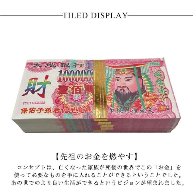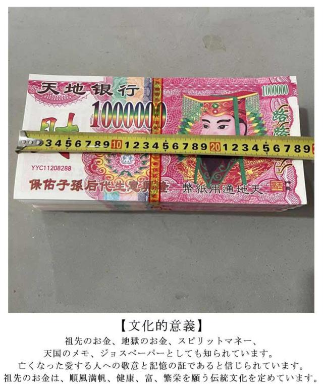 | 【先祖のお金を燃やす】コンセプトは、亡くなった家族が死後の世界でこの「お金」を使って必要なものを手に入れることができるということでした。あの世でのより良い生活ができるというビジョンが望まれました。 【文化的意義】祖先のお金、地獄のお金、スピリットマネー、天国のメモ、ジョスペーパーとしても知られています。 亡くなった愛する人への敬意と記憶の証であると信じられています。祖先のお金は、順風満帆、健康、富、繁栄を願う伝統文化を定めています。 【多用途な儀式用】- 祖先のお金は、葬式、先祖の死の記念日、清明祭、お盆、空腹の幽霊祭り、物理的な世界と精神的な領域をつなぐものとして使用できます。 愛、尊敬、記憶の証となり、世俗的な祝福を先祖と共有したいという願望を表現します。 【幅広い用途】- 先祖のスピリチュアルコミュニケーションの儀式に使用したり、祖先の伝統を記念する教育ツールとして使用したりするかどうかにかかわらず、当社の祖先のお金は深遠な文化的アーティファクトとして機能します。 さらに、哲学やスピリチュアリティを好む人へのユニークな装飾や心のこもった贈り物としても使用できます。 | |