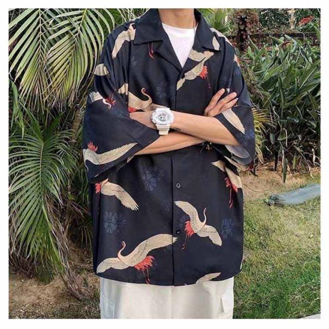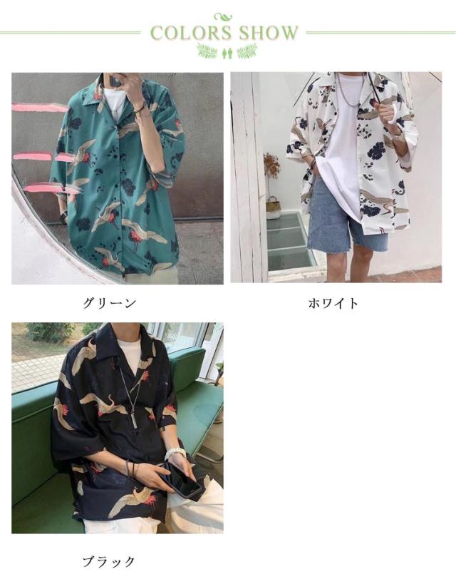 鶴柄 シャツ メンズ 柄シャツ 和風 ビッグシャツ 半袖 鶴柄 アロハシャツ ビッグシルエット シャツ 総柄 レディース 男女兼用 涼しい カジュアルシャツ 韓国ファッション 大きいサイズ 春 夏 秋 送料無料