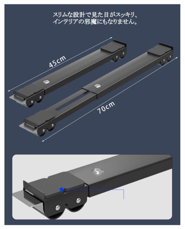 | サイズについての説明 | 長さ約45.5-70cm調節可能 高さ約4cm 幅約5cm 耐荷重:300KG 360度回転できるキャスター付き ※サイズ表の実寸法は商品によって多少の誤差がある場合がございます。 |