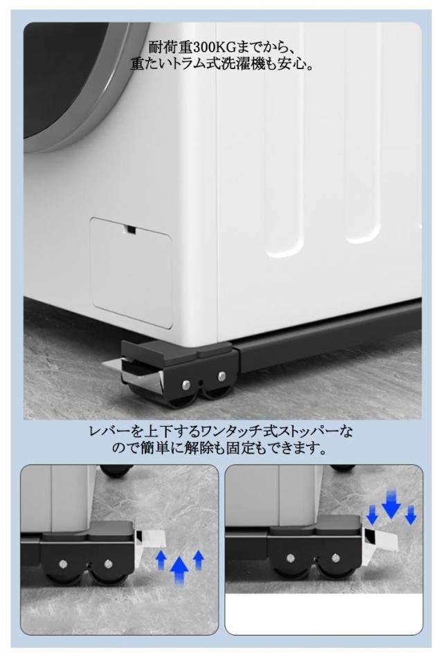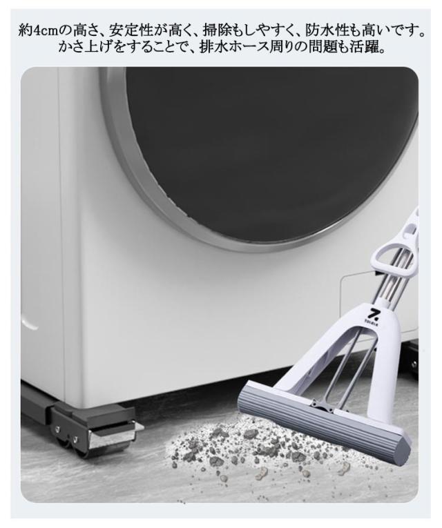 | 【360度回転キャスター2個セット】 キャスターが360度回転できる最新モデル。 前後だけでなく、左右に引き出すこともでき、家具の向きを変更したりなど、移動時もっと楽チン。女性一人でも気軽に動かせます。 設置するだけで洗濯機や冷蔵庫周りや下の掃除がラクラク♪防振パッド付きで洗濯時の音も小さくなります。 耐荷重300KGまでから、重たいトラム式洗濯機も安心。 約4cmの高さ、安定性が高く、掃除もしやすく、防水性も高いです。かさ上げをすることで、排水ホース周りの問題も活躍。 レバーを上下するワンタッチ式ストッパーなので簡単に解除も固定もできます。 スリムな設計で見た目がスッキリ、インテリアの邪魔にもなりません。 | |